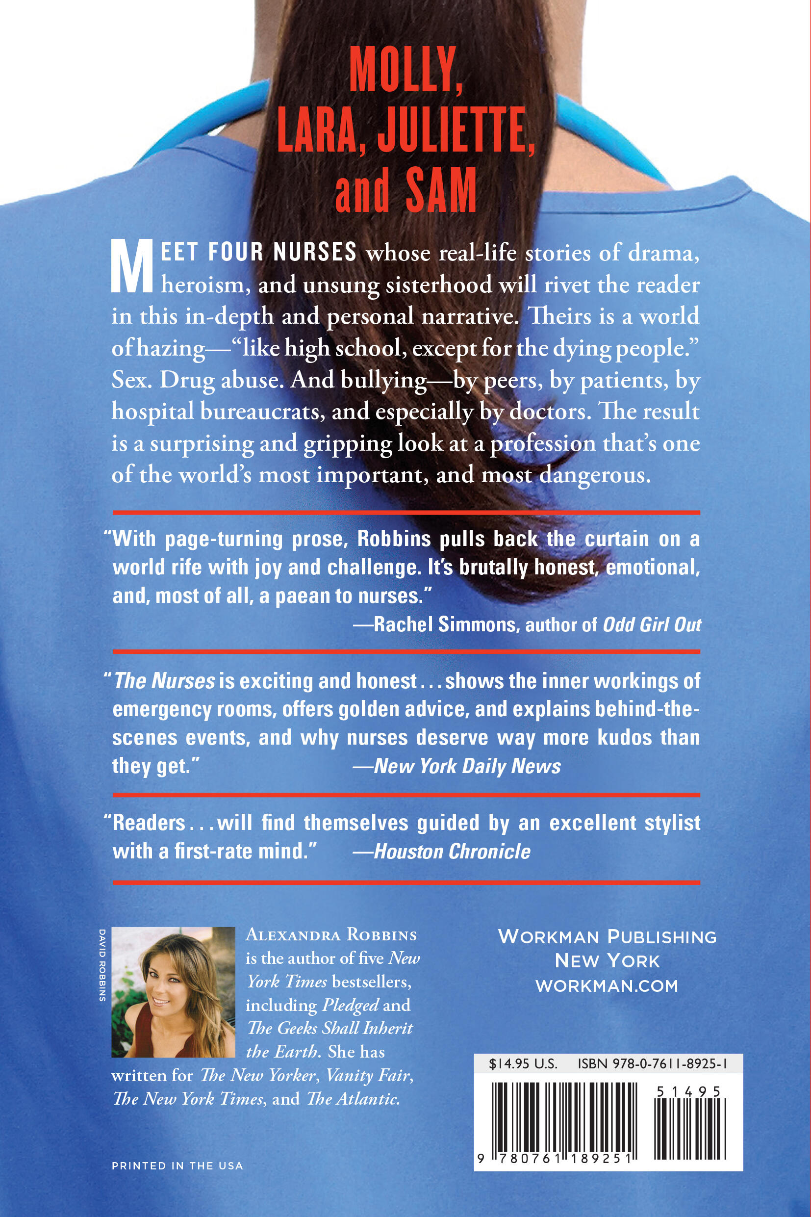 In following four nurses, Alexandra Robbins creates sympathetic characters while diving deep into their world of controlled chaos. It’s a world of hazing—“nurses eat their young.” Sex—not exactly like on TV, but surprising just the same. Drug abuse—disproportionately a problem among the best and the brightest, and a constant temptation. And bullying—by peers, by patients, by hospital bureaucrats, and especially by doctors, an epidemic described as lurking in the “shadowy, dark corners of our profession.”