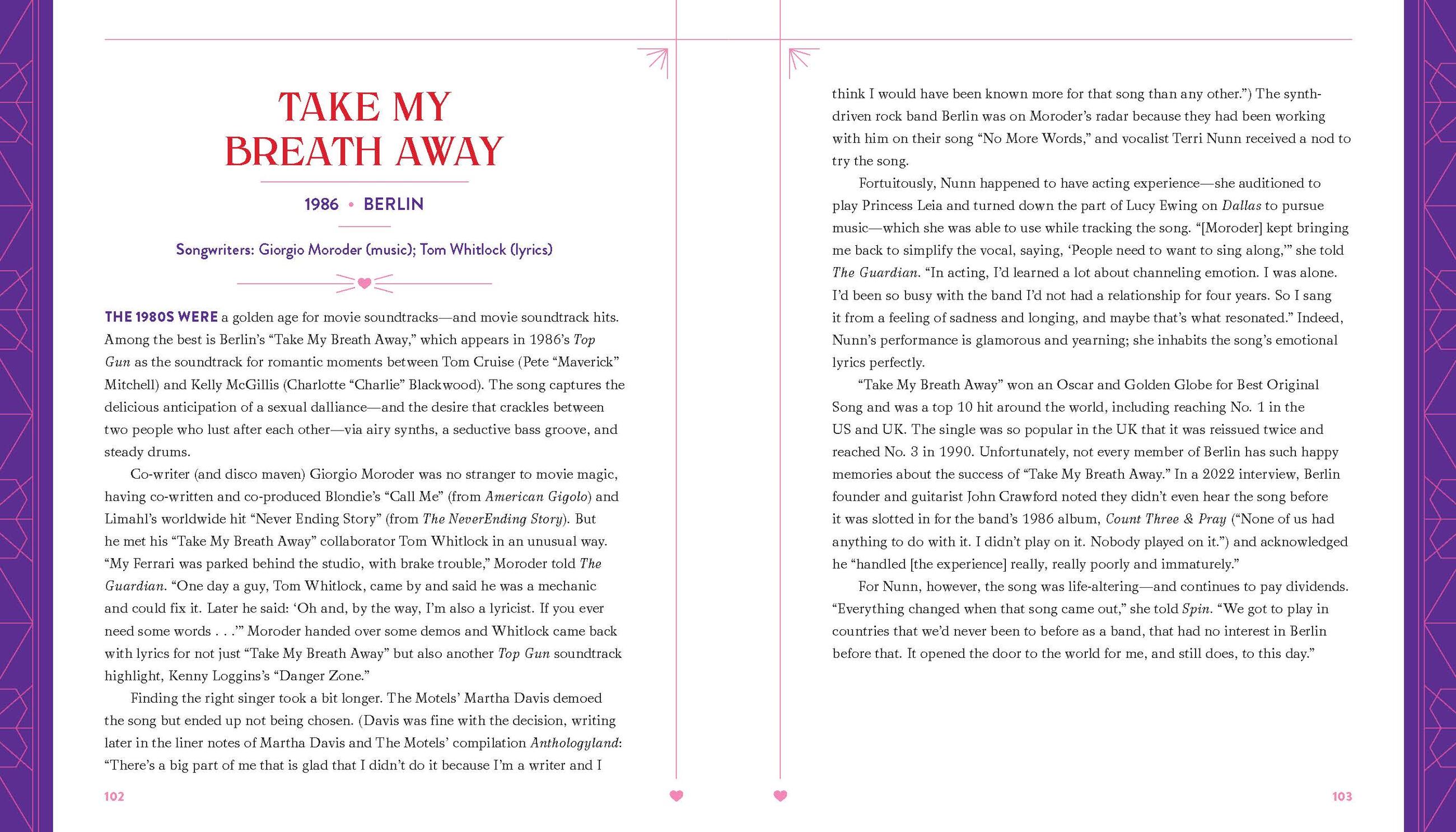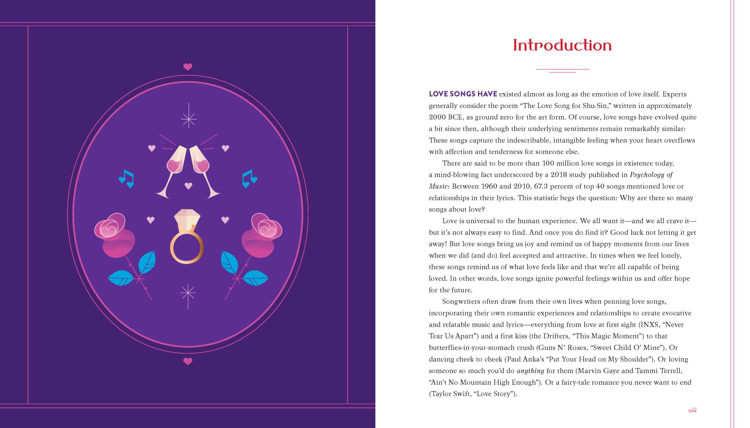 "An attractive embellished compendium of 100 romantic songs. . . . Conversational and enlightening without being overly analytical, this compilation of the history and anecdotes behind selected English-language popular songs, arranged chronologically and by vocalist, spans from Fred Astaire’s rendering of 1936’s “The Way You Look Tonight” to Harry Styles’s 2019 song “Adore You” and ranges in tone from hopeful to exuberant to heartrending. Each entry (always crediting the songwriters in addition to the performers) is restricted to a manageable few paragraphs, plus partial song lyrics. Topics include romantic affection, friendship, and even human-animal companionship. A bonus to the regular entries is eight “top 10” boxes scattered throughout the text listing the best tunes about romantic power, bad partners, breakup, heartbreak, unrequited love, revenge, and being misunderstood, plus the best songs for a first dance at a wedding. VERDICT These reminders of popular culture melodies covering nearly 100 years will foster wistful reflection."Library Journal