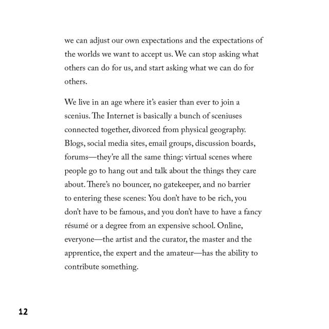 “It’s not often that I find myself reviewing a book that I can say has already changed my life. . . . At a crucial turn in this fabulous little wallop of a book comes the simple directive, ‘Share something small every day.’ That ‘something’ oughtn’t be your Instagrammed latte or a selfie, but something ‘useful or interesting’ about your work. Put enough somethings out there, and a lone artist or entrepreneur can soon be a productive part of a creative community.”