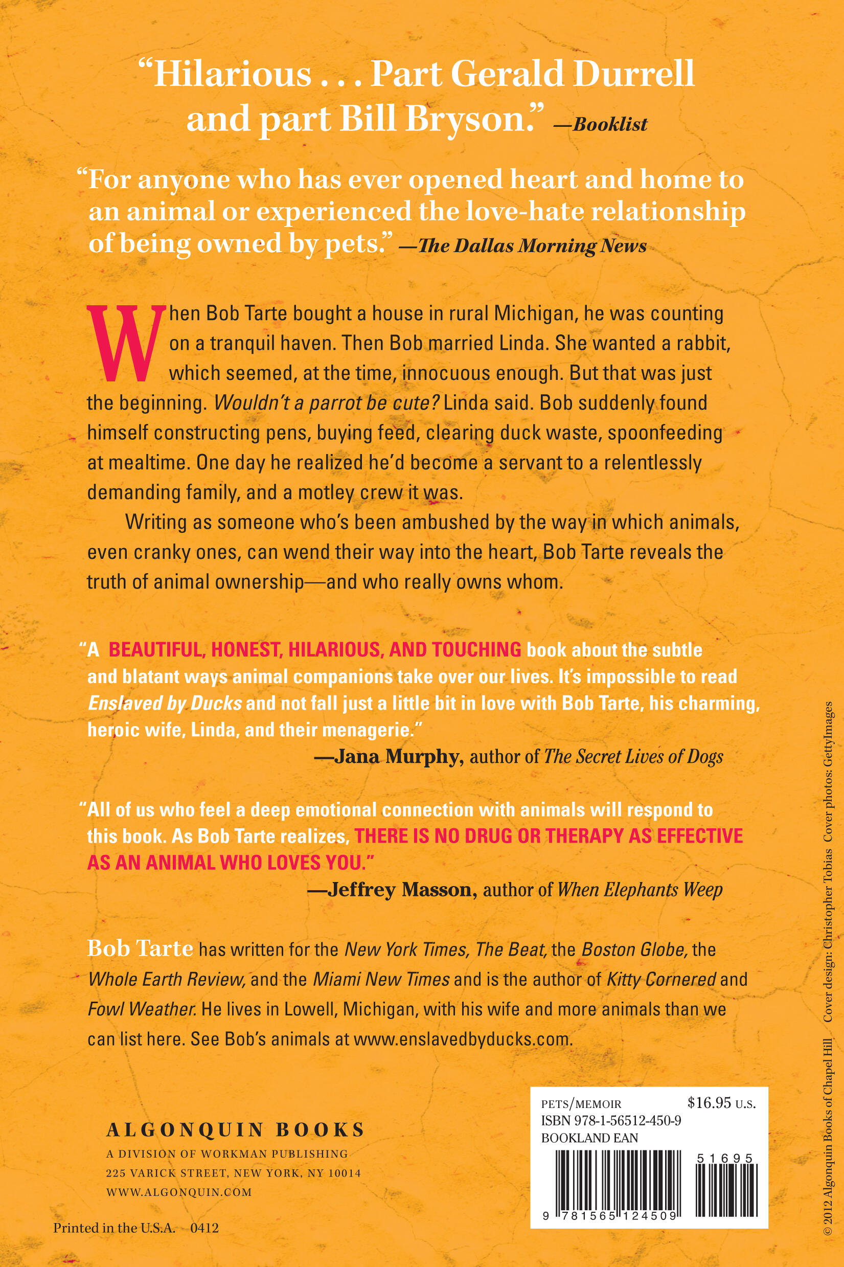 When Bob Tarte bought a house in rural Michigan, he was counting on a tranquil haven. Then Bob married Linda. She wanted a rabbit, which seemed innocuous enough until the bunny chewed through their electrical wiring. And that was just the beginning. Before long, Bob found himself constructing cages, buying feed, clearing duck waste, and spoon-feeding a menagerie of furry and feathery residents. His life of quiet serenity vanished, and he unwittingly became a servant to a relentlessly demanding family. “They dumbfounded him, controlled and teased him, took their share of his flesh, stole his heart” (Kirkus Reviews).
