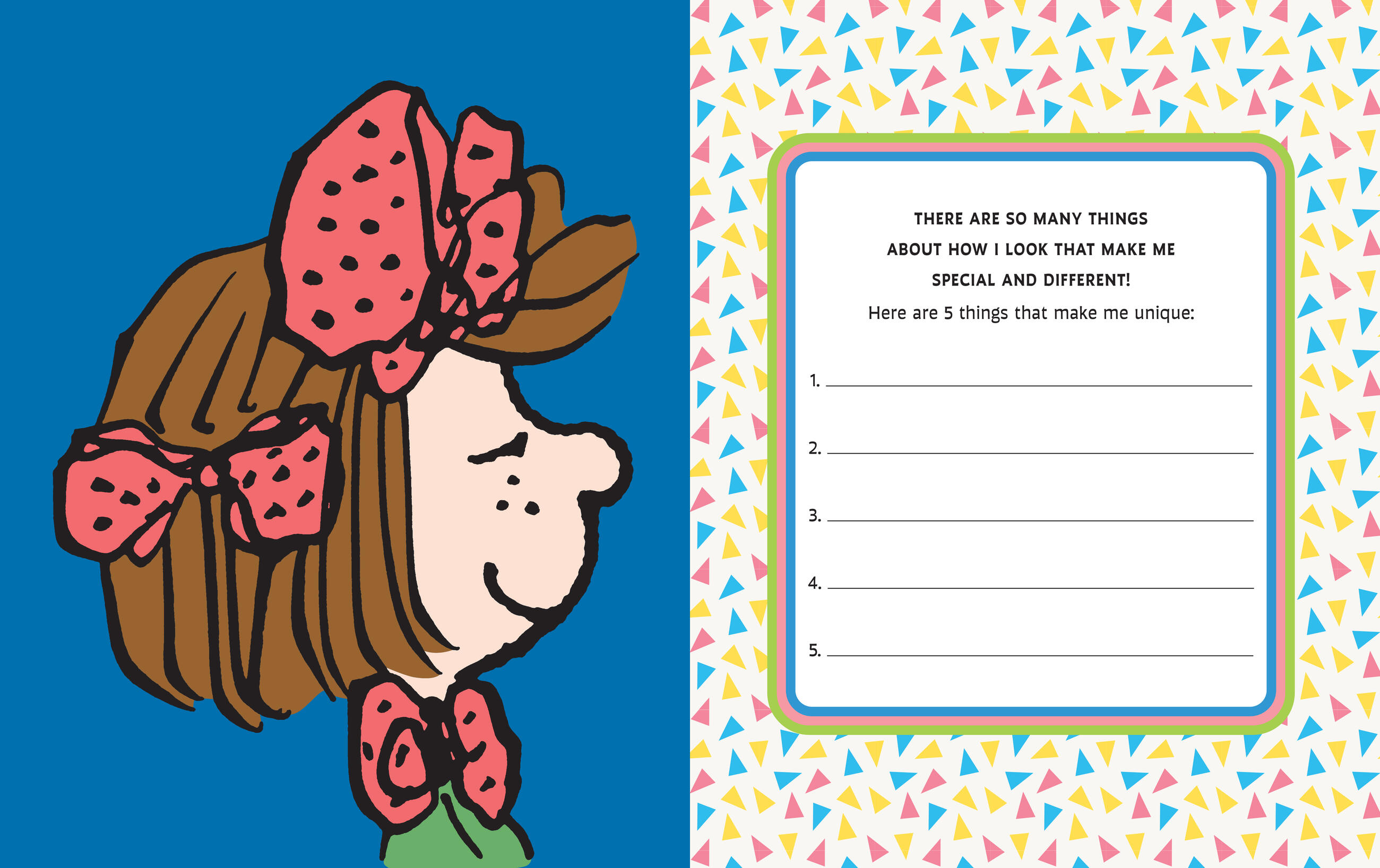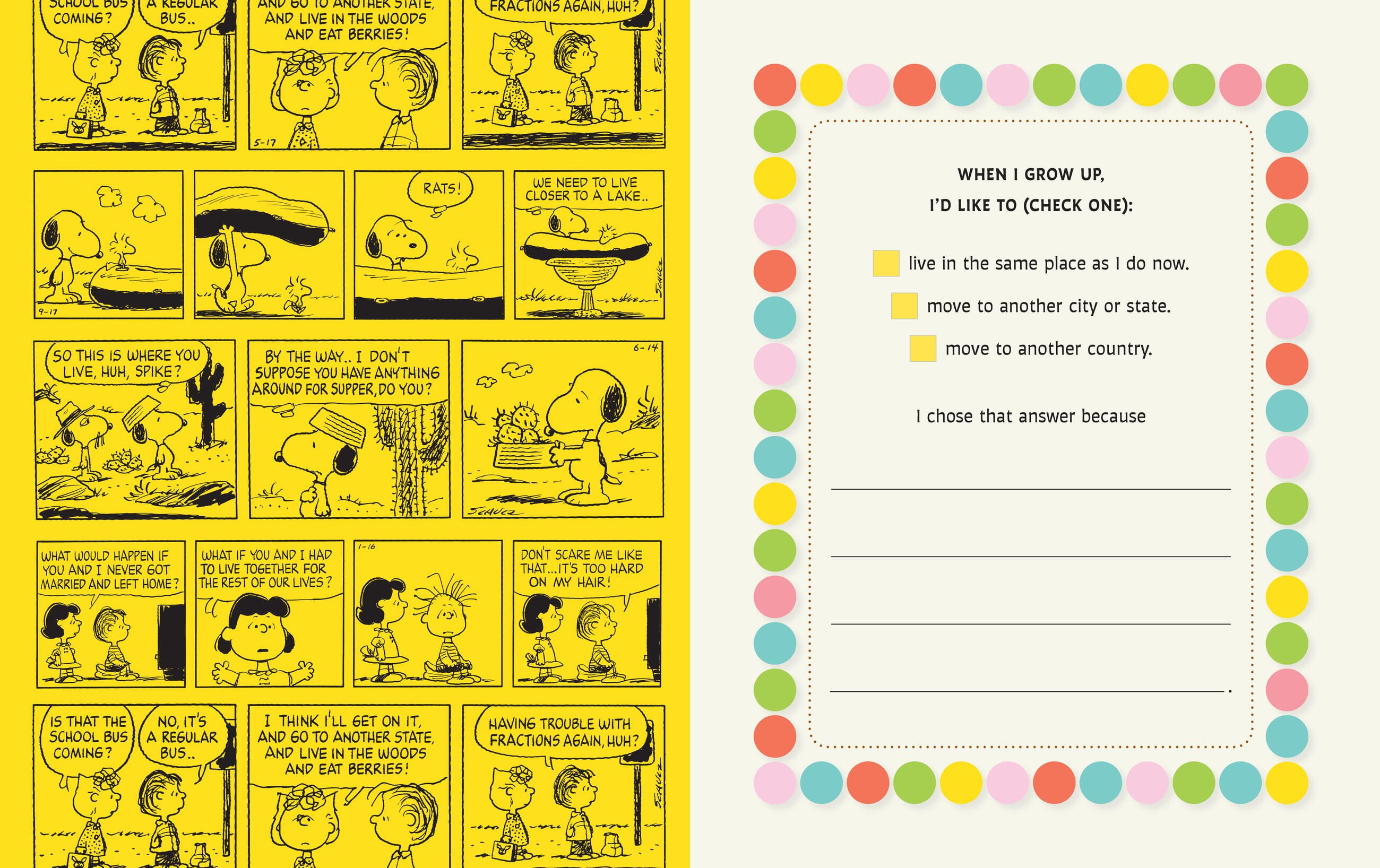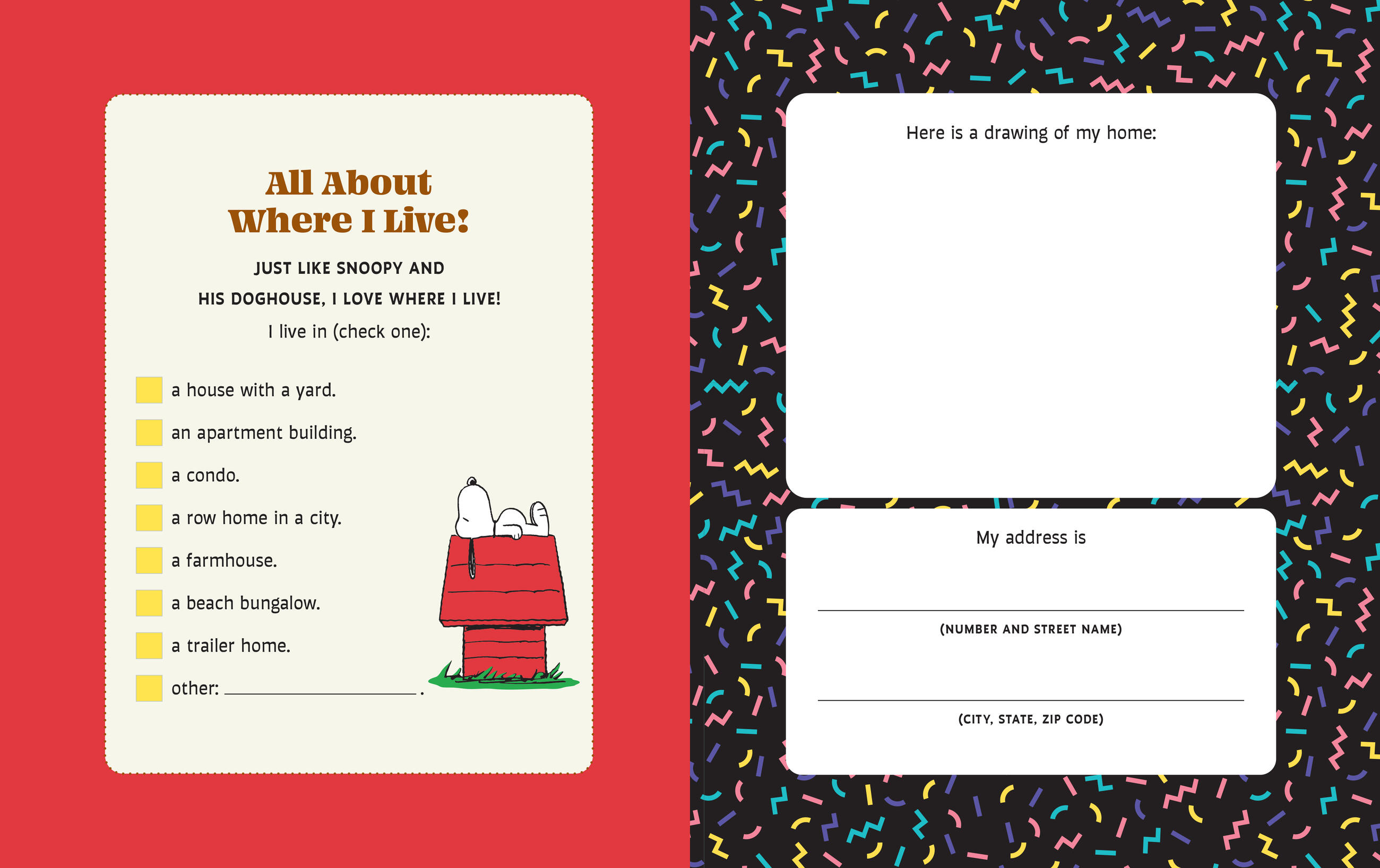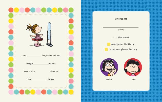 Let the Peanuts gang guide you in filling in a book all about you and what you like! Draw a picture of yourself to peek through the cover and then fill in the pages of the book, answering questions such as: What color is your hair? How about your eyes? What sports do you like best? What are your hobbies? Is your favorite color yellow or red or blue? If you could travel into outer space, where would you want to visit? Do you like to give advice or receive advice from friends? If you had a dog, what color would its doghouse be? This fun, colorful, and interactive book is one that only you can create.