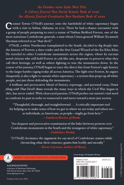 “The truth is that we Southerners have always needed dedicated, self-reflective young folks from the North guided by genius and radical love to help us exorcise the worst parts of our region. Connor Towne O’Neill walks in that radical love tradition in Down Along with That Devil’s Bones, but he does something more here. He decimates the argument for our need of Confederate statues while chronicling what their existence grants him bodily and morally.”
