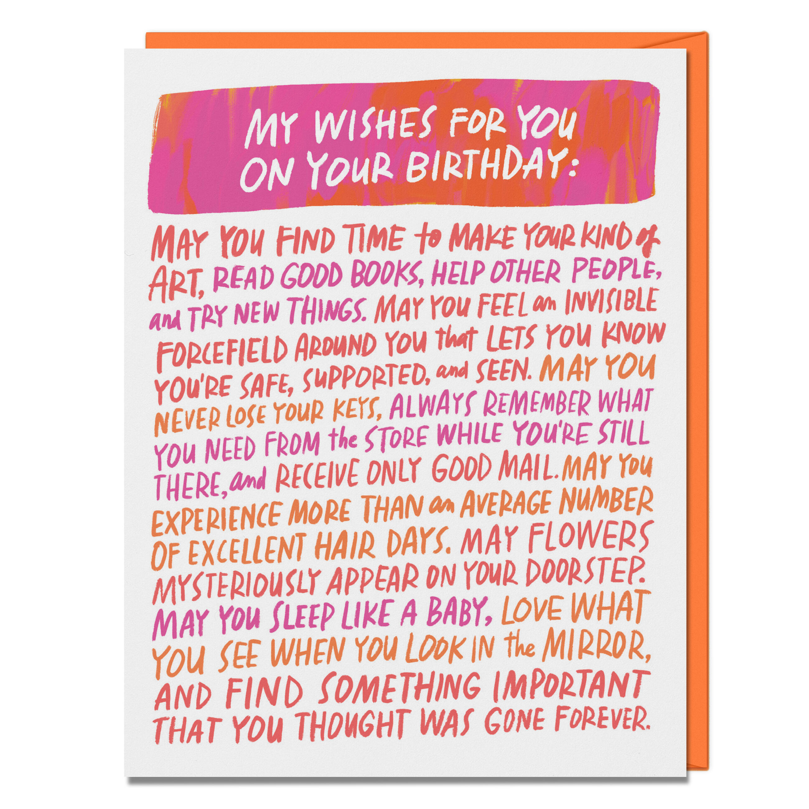 Birthday cards are pretty much all the same, except this one! Pass along wonderful wishes for the year ahead—like finding lost keys and having good hair days—and let ’em know you’ve got their best interests at heart all year round.