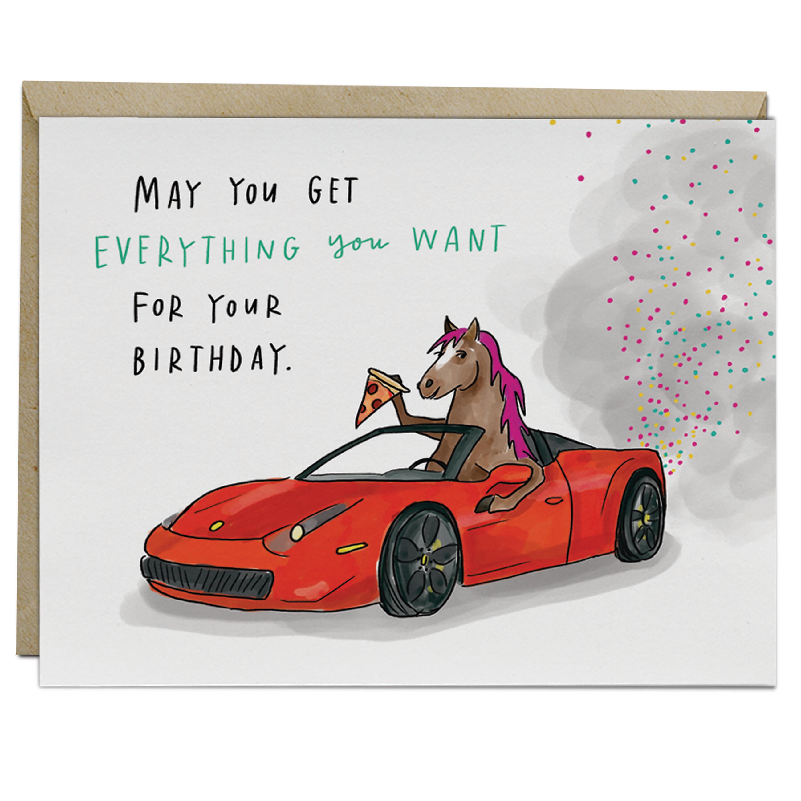 “May you get everything you want for your birthday.” Pony, check. Ferrari, check, pizza, check. I mean, what else is there to wish for? A yacht? Now you’re just getting greedy.
