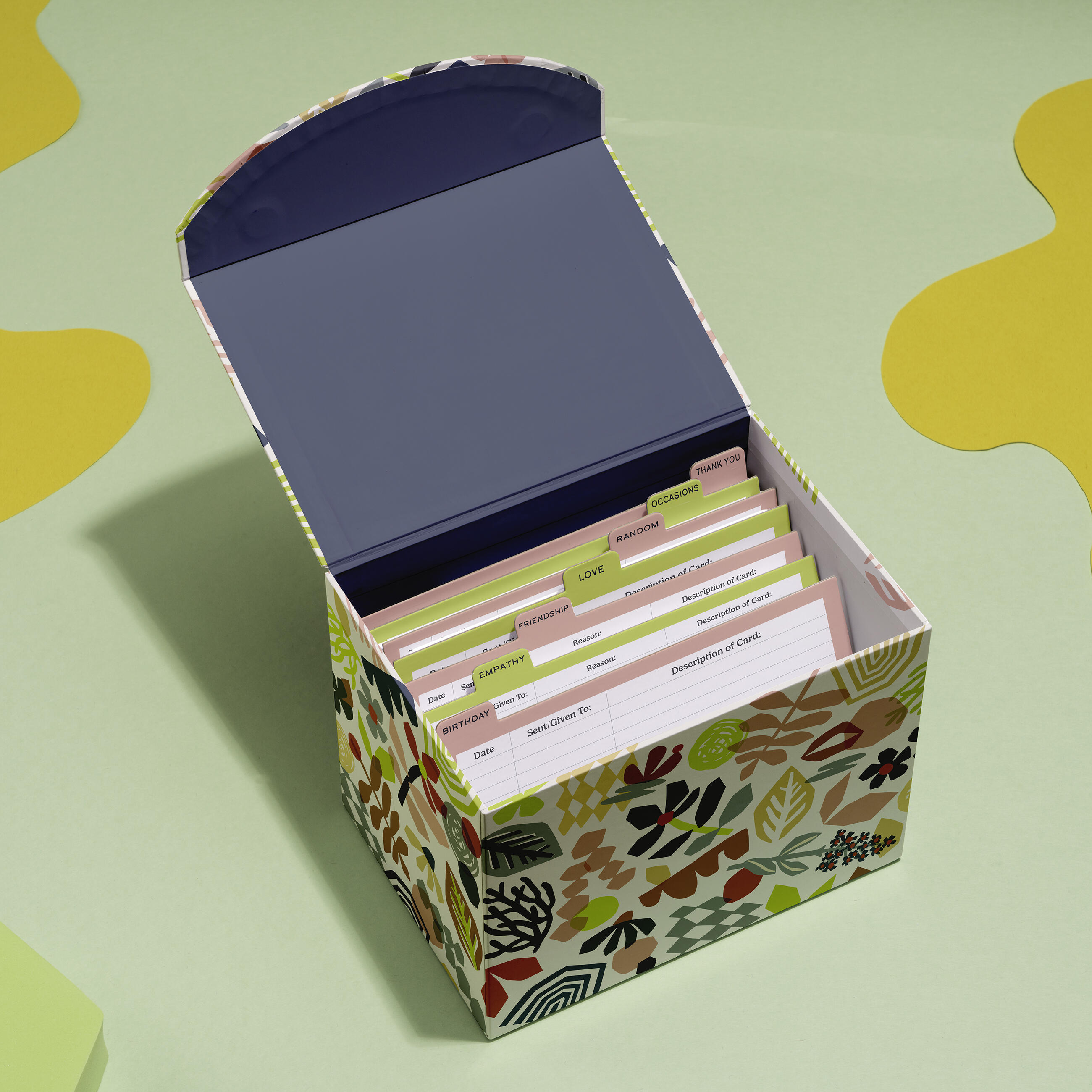 Hey, card lover! We created a box that’s like a file organizer for your cards, keeping ’em organized & safe from coffee spills & cat paws. Besides being cute and sturdy, it’s roomy enough for 60+ cards—and comes stocked with 6 EMF greeting cards! Plus it’s got stickers, tabbed dividers, and a calendar for important dates! OH YEAH, plus an address keeper, trackers to log cards you’ve sent, and tips for writing cards! Did we forget anything? Hmmmmmm… Well, it doesn’t come with a nice warm mug of tea. We thought it might spill.