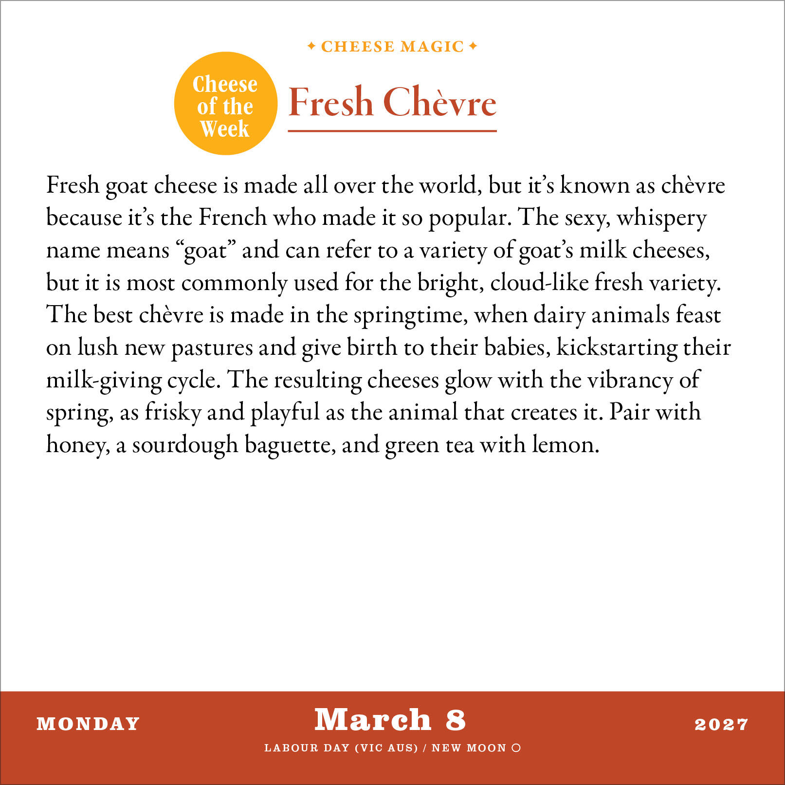 BASED ON BELOVED BRAND: Written by Erika Kubick, self-proclaimed cheese preacher and founder of Cheese Sex Death, this calendar is packed with her tips for deliciously unexpected pairings (lavender and goat cheese chocolate truffles), elevating your cheesy breakfast sandwich, storing your cheese, and much more.