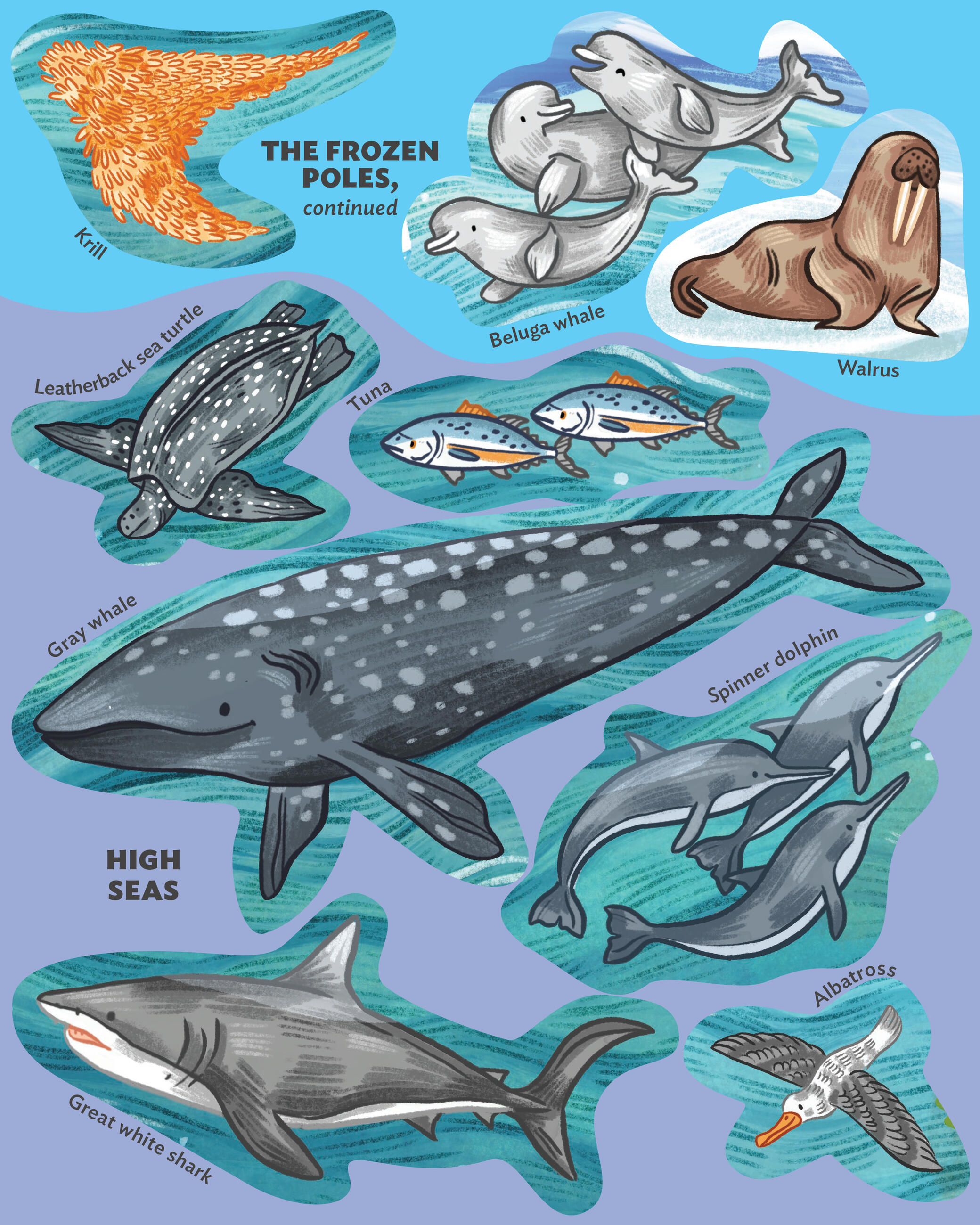 From those dwelling on the shore and in the air like polar bears, emperor penguins, sea otters, and albatross, to the swimmers like clownfish, moray eels, lionfish, hammerhead sharks, dumbo octopuses, and Beluga whales, to the deep sea bottom dwellers like hermit crabs, sea squirts, barnacles, and giant clams, kids will love following the clues to match the creature to its place on the poster. The completed poster, measuring 15 x 28 inches, makes a stunning piece of wall art that kids can feel proud to display.