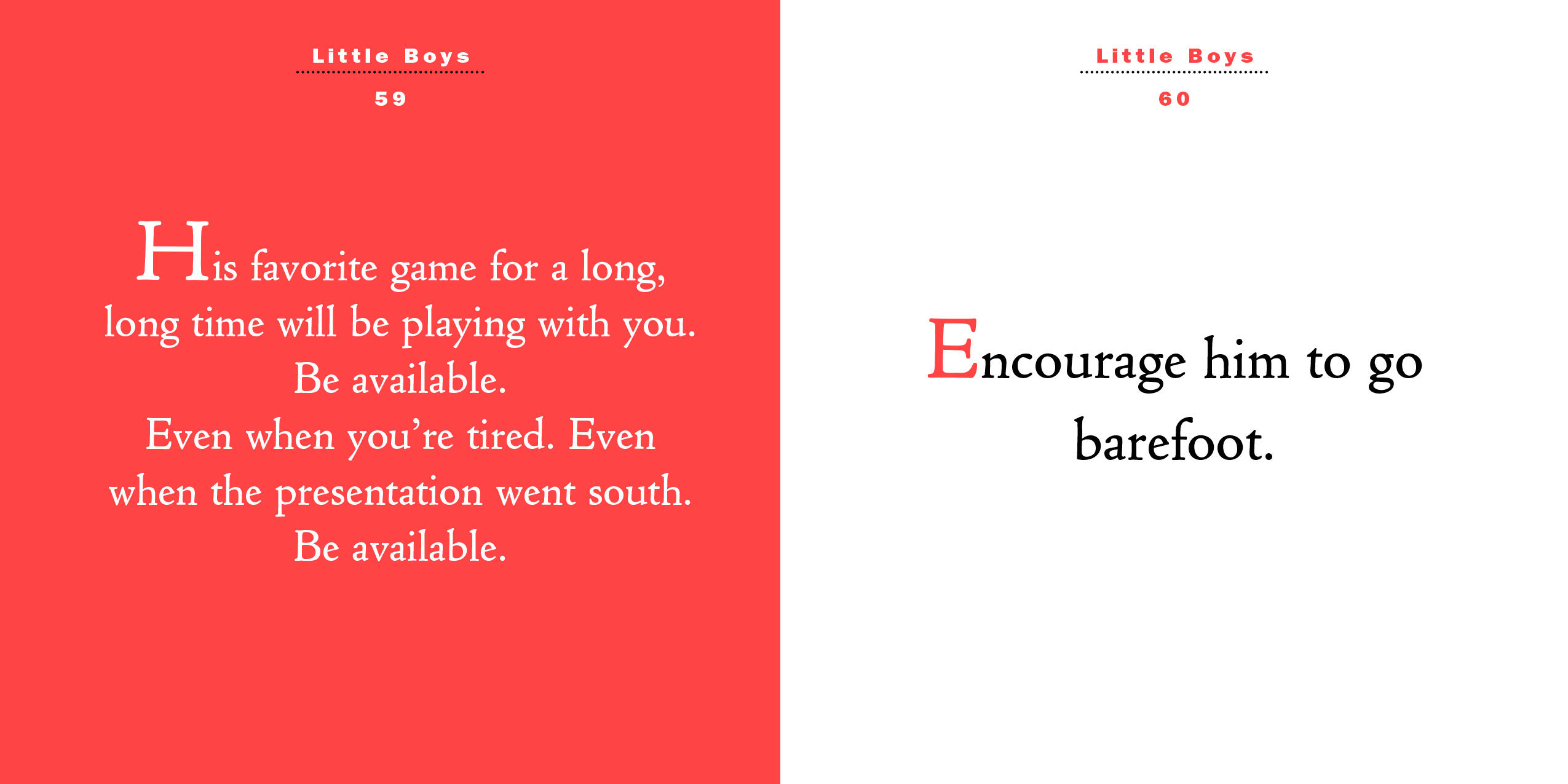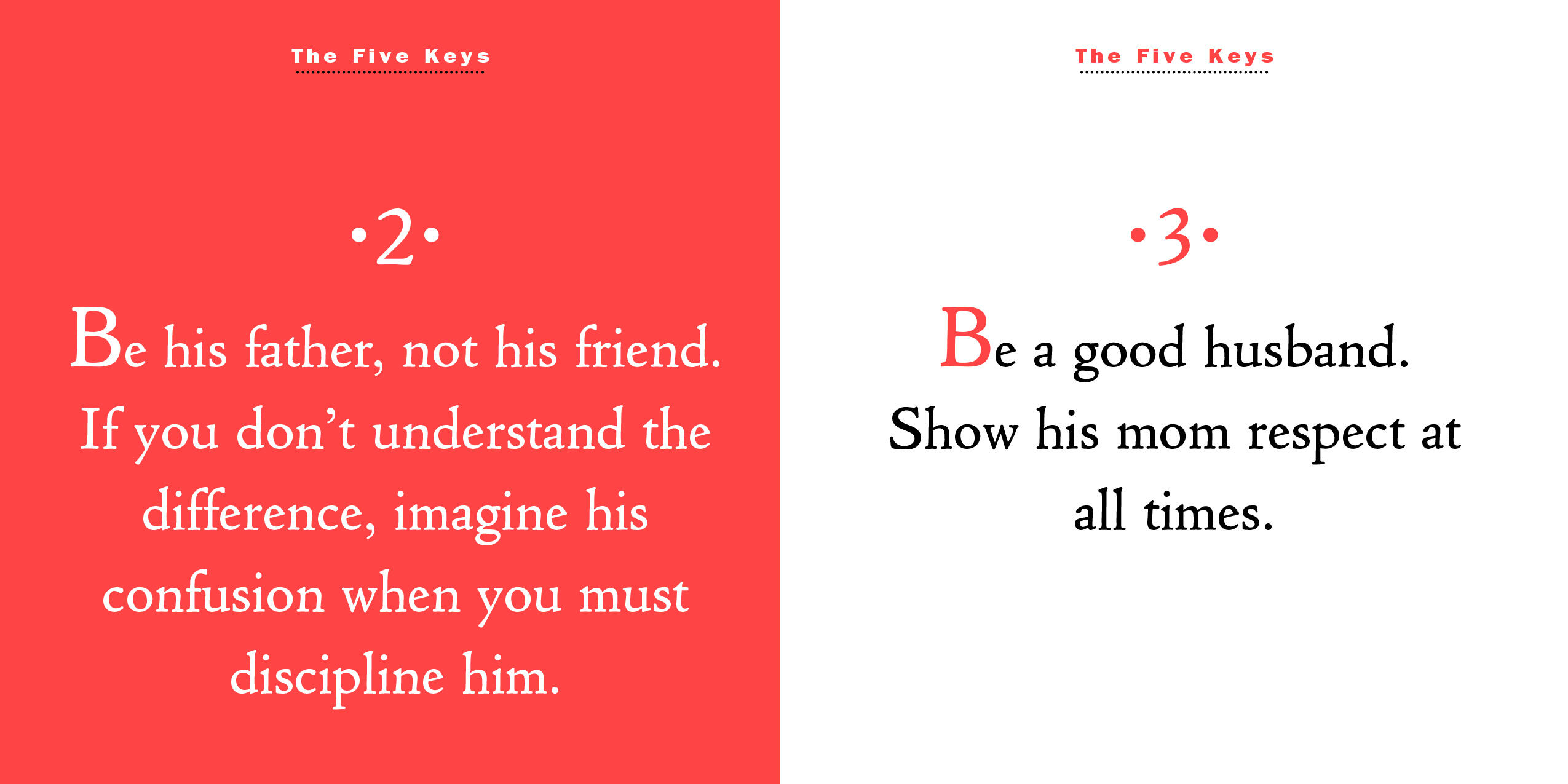 Freshly updated, the book begins with the Five Keys of Parenting, a guide to navigating the extraordinary, even if sometimes exasperating, journey of parenthood. It’s filled with the importance of nurturing responsibility: Teach him that the world will judge him by his actions, not his intentions. Fun stuff: Have tea with him in the afternoons. Serve cookies. And when he’s ready to go: Hug him fiercely.