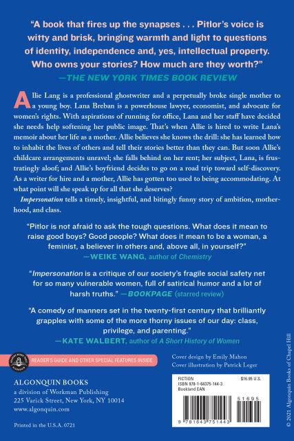 “Looking for a book that fires up the synapses? Check out Heidi Pitlor’s Impersonation . . . Pitlor’s voice is witty and brisk, bringing warmth and light to questions of identity, independence and, yes, intellectual property. Who owns your stories? How much are they worth? Allie Lang’s answers are complicated. Watching her reach them is like sitting down with a refreshingly honest friend who skips the part about how great her life is and dives right into the real stuff. We need more friends like this. Authors, too.”Weike Wang, author of Chemistry