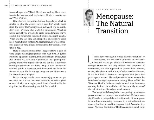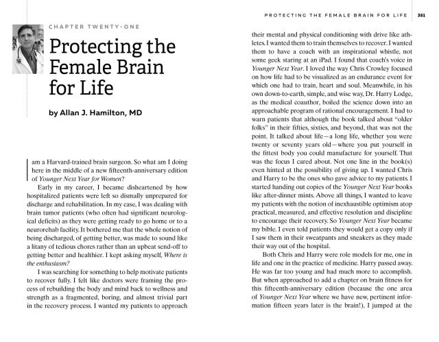A book of hope, Younger Next Year for Women shows you how to become functionally younger for the next five to ten years, and continue to live thereafter with newfound vitality. Learn how the Younger Next Year plan of following “Harry’s Rules”—a program of exercise, diet, and maintaining emotional connections—will not only help you turn back your physical biological clock, but will improve memory, cognition, mood, and more. In two new chapters, prominent neurologist Allan Hamilton explains how the program directly affects your brain—all the way down to the cellular level—while Chris Crowley, in his inimitable voice, gives the personal side of the story. In other words, how to live brilliantly for the three decades or more after menopause. The results will be amazing.