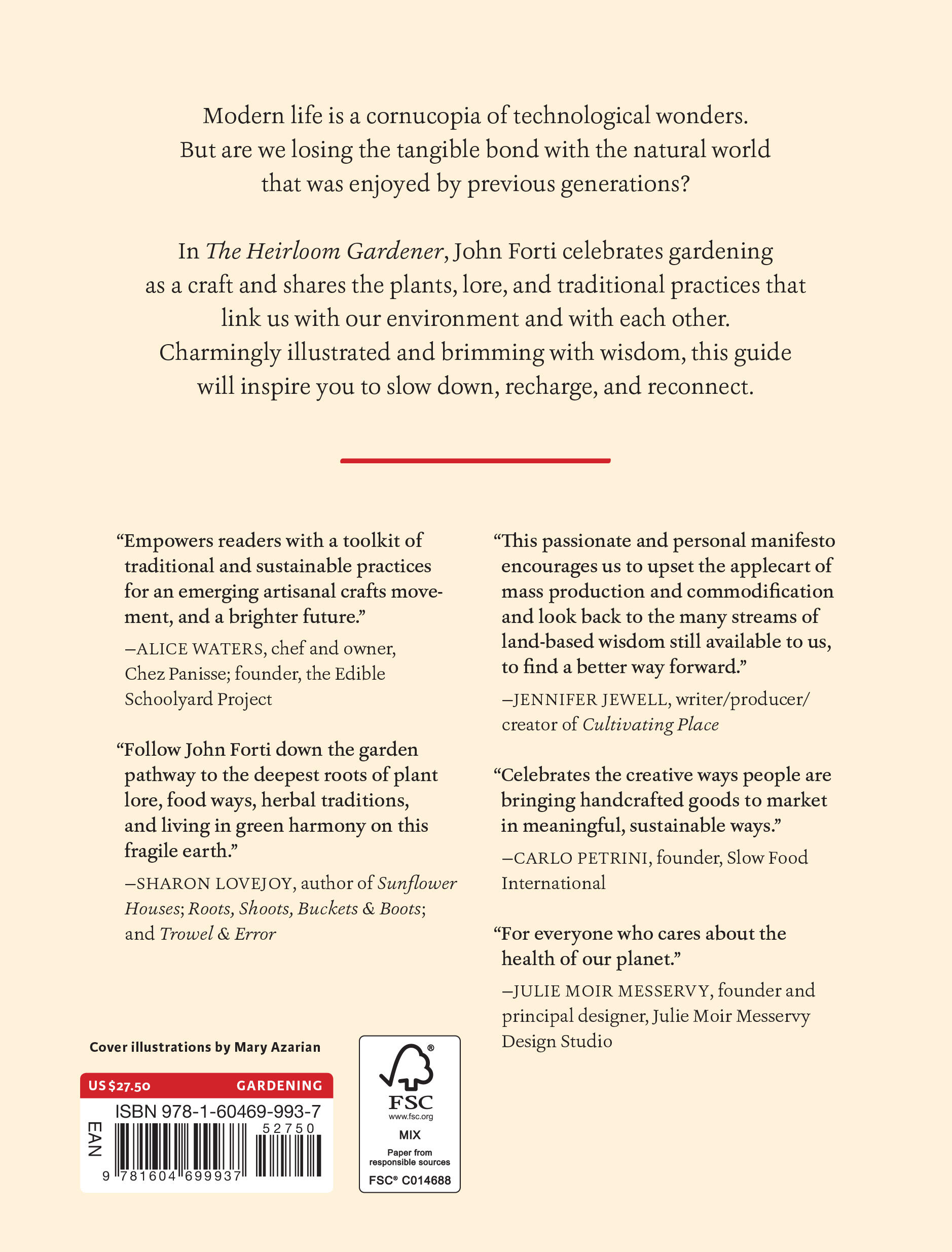 “The Heirloom Gardener empowers readers with a toolkit of traditional and sustainable practices for an emerging artisanal crafts movement, and a brighter future.” —Alice Waters, chef and owner, Chez Panisse; founder, The Edible Schoolyard ProjectThe Wanderer “Garden historian John Forti eloquently shares his passion for heirloom plants, historic garden techniques, and traditional crafts…this book is sure to delight anyone interested in garden history and learning how to enjoy the fruits of the garden.” –The American Gardener
