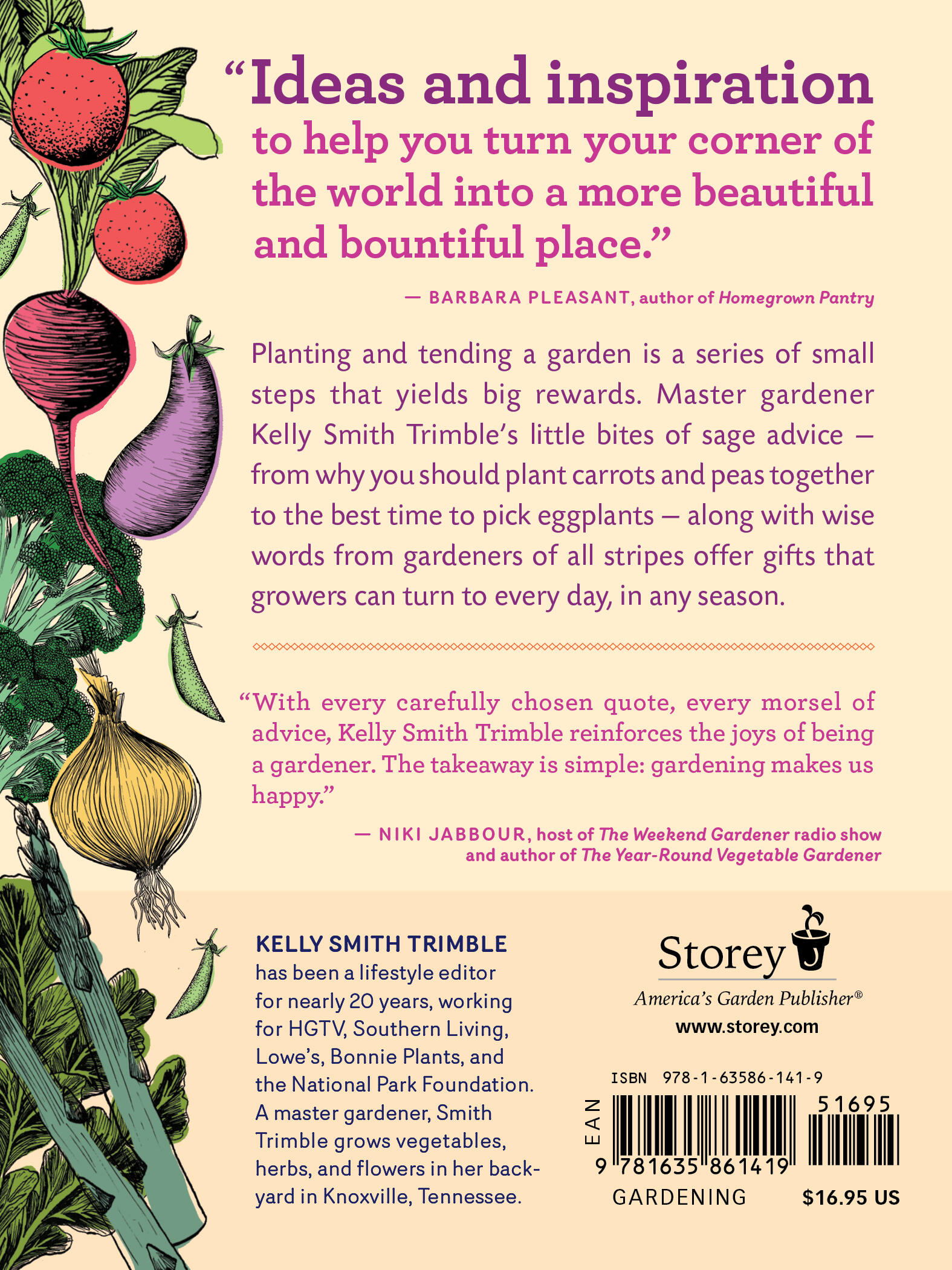 “This is not a book for the shelf, but one for the coffee table or bedside table, where it can be savored every single day. Kelly Smith Trimble guides us through the seasons with her practical tips paired with inspiration from some of the most respected voices in gardening. With every carefully chosen quote, every morsel of advice, Trimble reinforces the joys of being a gardener. The takeaway from this book is simple: gardening makes us happy.” — Niki Jabbour, host of The Weekend Gardener radio show and author of The Year-Round Vegetable Gardener