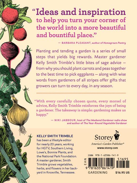Sometimes the best gardening advice comes in tidbits shared over the backyard fence from a sage neighbor. In Vegetable Gardening Wisdom, Master Gardener Kelly Smith Trimble shares her tried-and-true ideas and guidance for finding success and enjoyment in every aspect of vegetable gardening. Trimble invites readers to dip in regularly for bite-sized pieces of information on topics ranging from herb and vegetable gardening to cooking, preserving, and creative ways to use the harvest along with ideas for reducing garden and kitchen waste, all presented in a lively, beautifully designed package that makes a perfect gift and source for daily inspiration. She suggests the best herbs to grow indoors, the best way to start peas, how to use lettuce as a living mulch in the garden, how to make compost tea, how to identify beneficial bugs, how to blanch cauliflower, and much more. Woven in among her tips are helpful and inspiring quotes from other plant-loving folks, ranging from novelist Jamaica Kincaid to vegetable gardening guru Ed Smith and renowned chef Sean Brock.