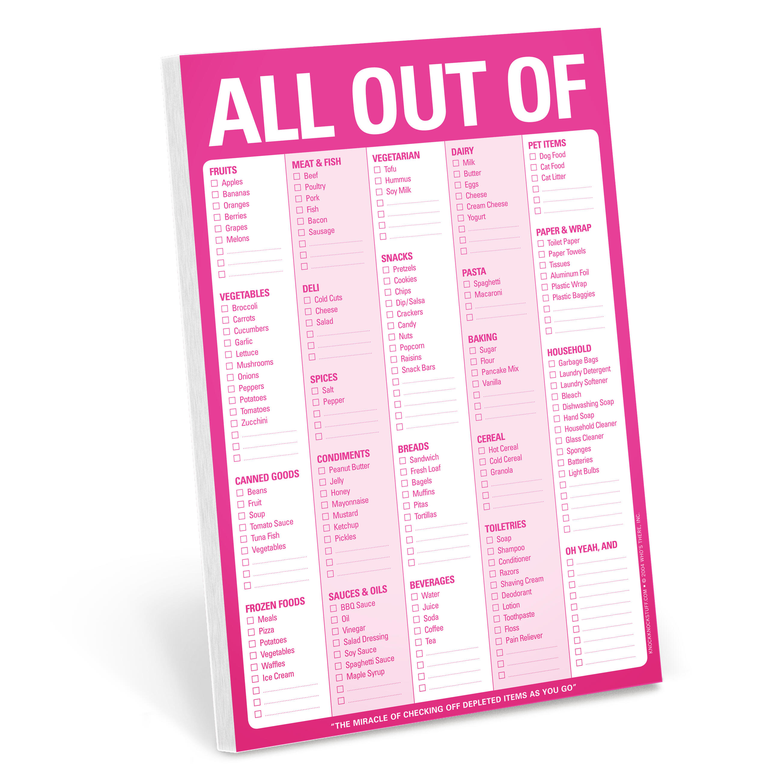 Who hasn’t wandered blindly at the grocery store, trying to remember what to buy? Now available in a shock-and-awe shade of pink, this perennial favorite lets you check off depleted items as you run out, then replenish with ease and certainty when next you shop.
