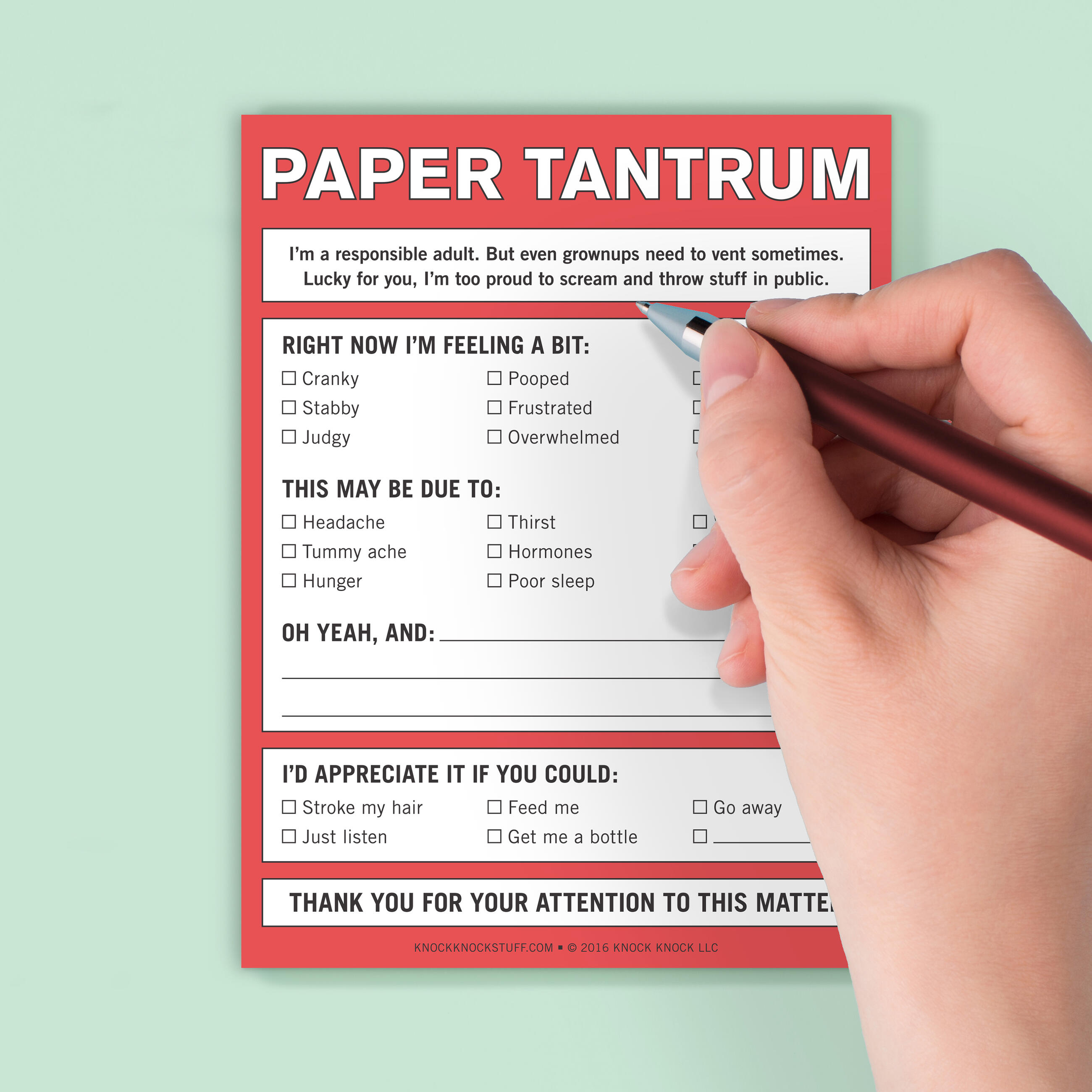 When it comes to meltdowns, babies get all the excuses: “She’s hungry.” “He’s overtired.” “She needs a change.” Reclaim your right to throw a fit at any age with this expressive pad, while maintaining your reputation for professionalism and maturity.