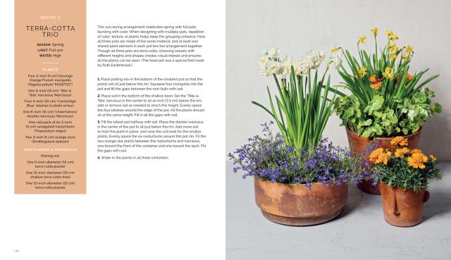 And recreating these stunning designs couldn’t be simpler! Each recipe includes a detailed ingredients list and step-by-step instructions, along with hundreds of photos showing where and how to place each plant. Also included is foundational information on planting techniques, care instructions, choosing the right container, as well as plant spotlights highlighting foolproof options for all climates and seasons, from spring bulbs to evergreens.