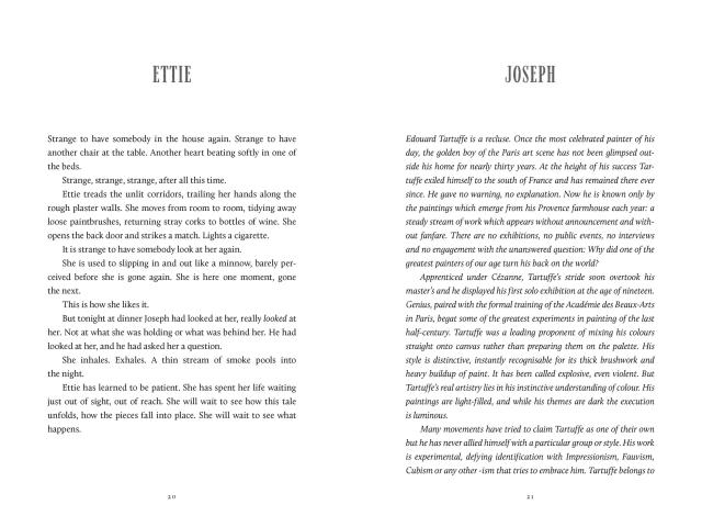 During a scorching summer in 1920s Provence, a young journalist, Joseph Adelaide, turns up at the farmhouse of reclusive artist Edouard Tartuffe, hoping to write an article about him. There, he meets Ettie, Tartuffe’s niece, who appears to do everything for her uncle—from cooking and cleaning to catering to his maniacal moods. Joseph is beguiled by where he finds himself, not just by this foreign place or Tartuffe himself, but by Ettie, who watches everything so quietly from the periphery. Both Joseph and Ettie carry scars from their pasts and it’s as they get to know each other that they start to lay bare those scars to themselves and to each other.