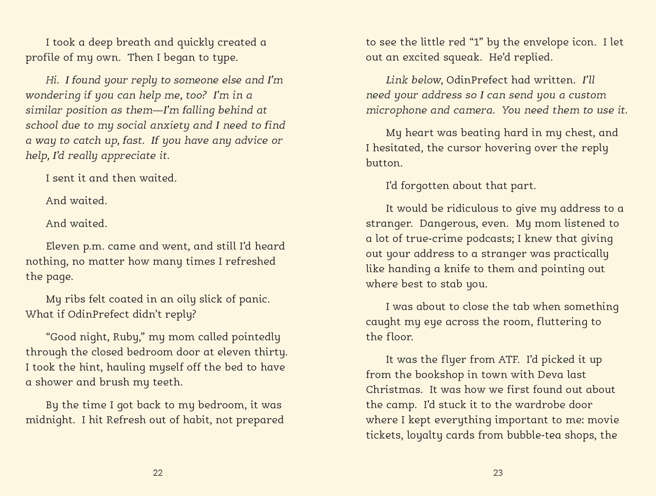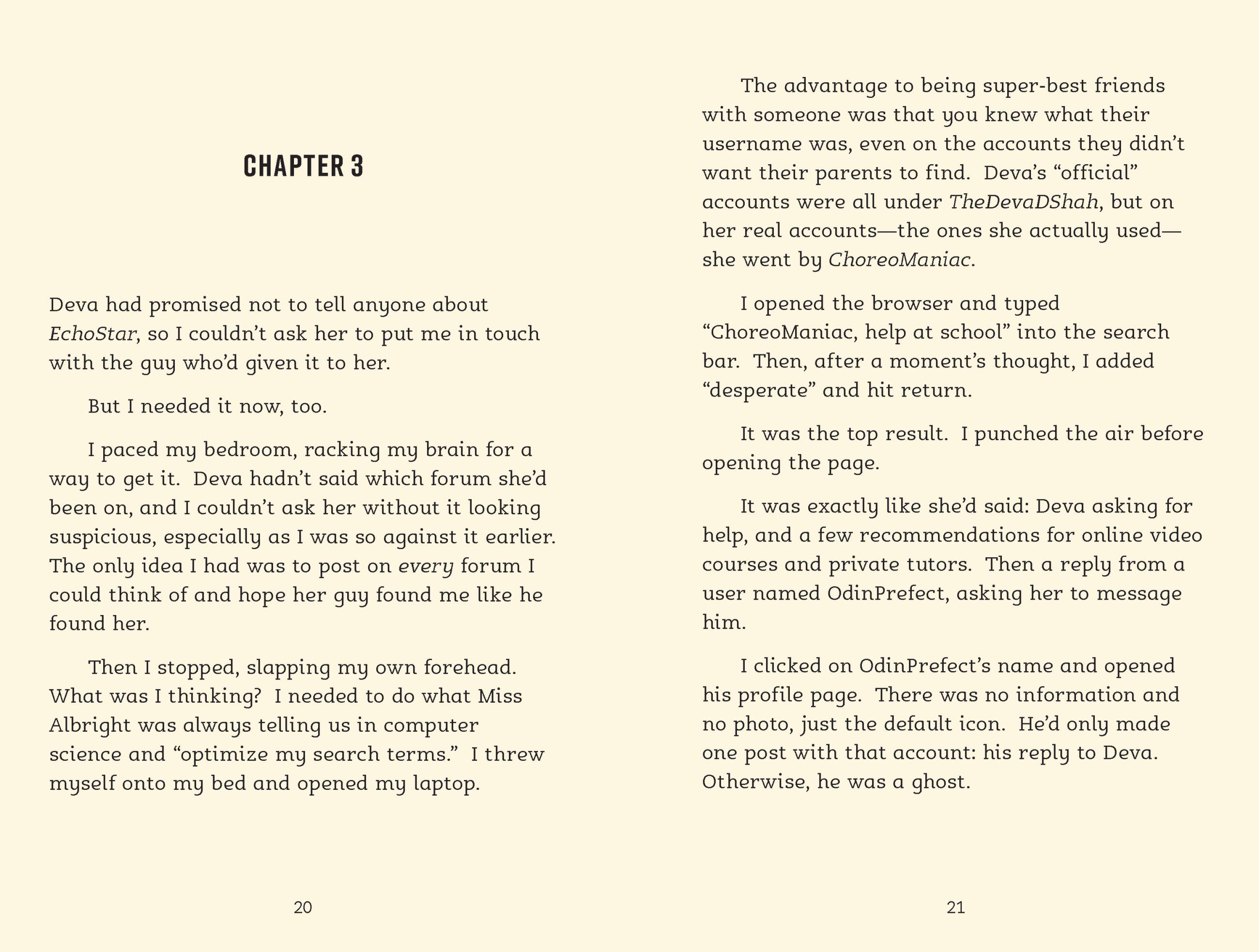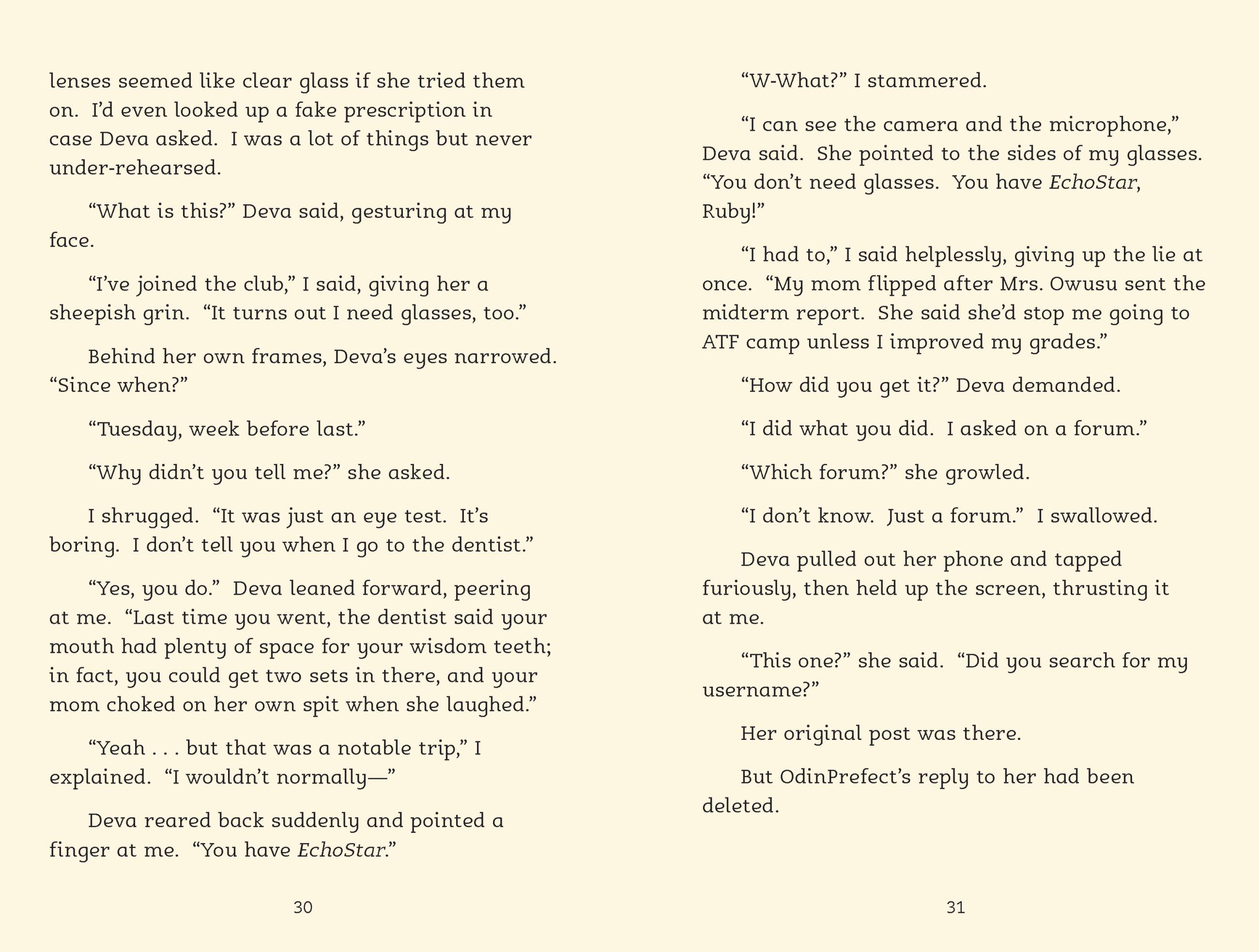Ruby and her best friend Deva have won free places at the Ash Tree Foundation Performing Arts Camp over the summer. There’s just one problem: they won’t be able to attend unless their grades seriously improve. When Deva suddenly starts getting high marks in all their subjects, a confused and hurt Ruby feels left behind. Then she finds out Deva’s success is due to EchoStar, a new app that’s helping her get ahead.
