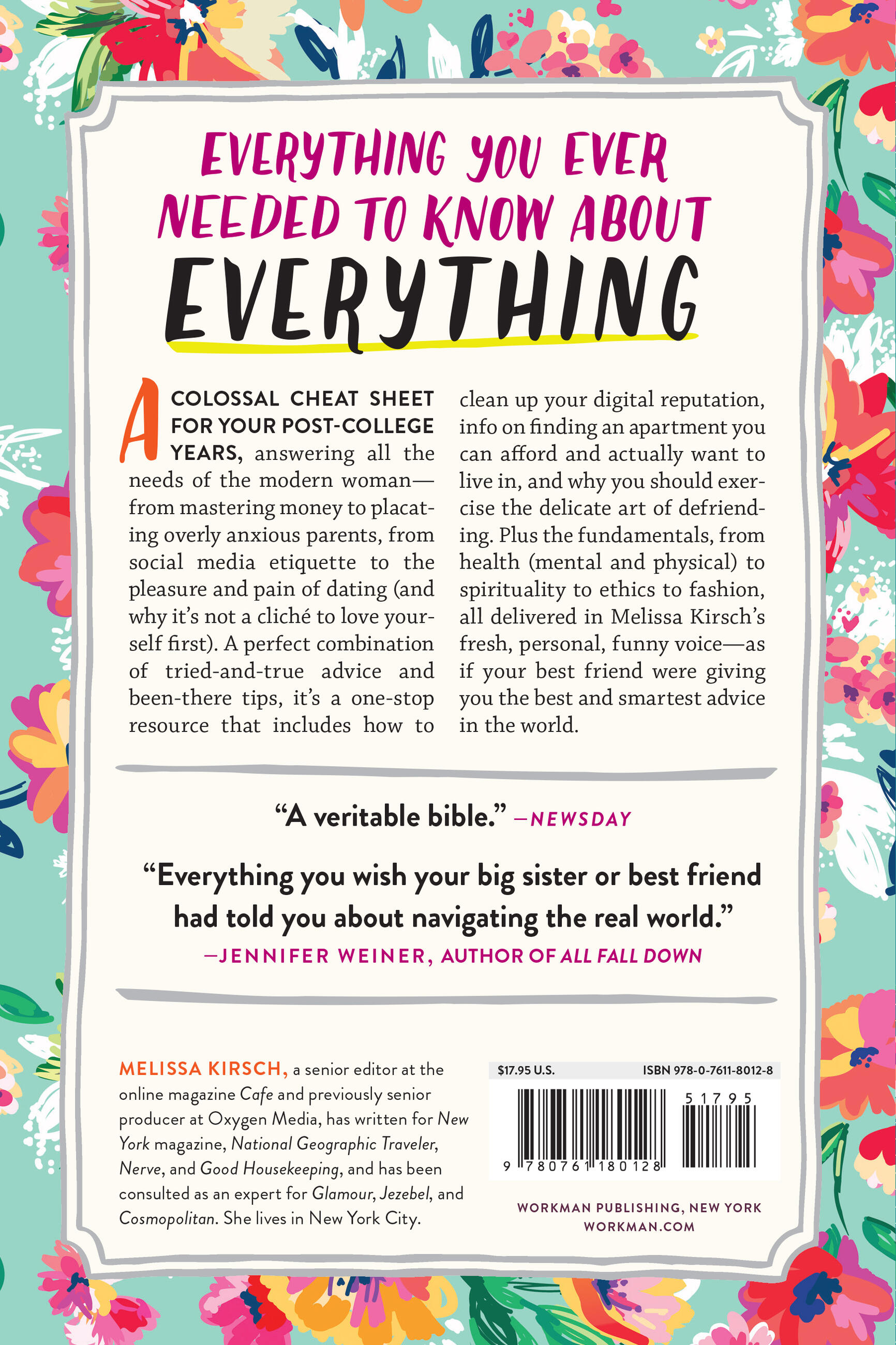 A perfect combination of tried-and-true advice and been-there tips, it’s a one-stop resource that includes how to clean up your digital reputation, info on finding an apartment you can afford and actually want to live in, and why you should exercise the delicate art of defriending. Plus the fundamentals, from health (mental and physical) to spirituality to ethics to fashion, all delivered in Melissa Kirsch’s fresh, personal, funny voice—as if your best friend were giving you the best and smartest advice in the world.