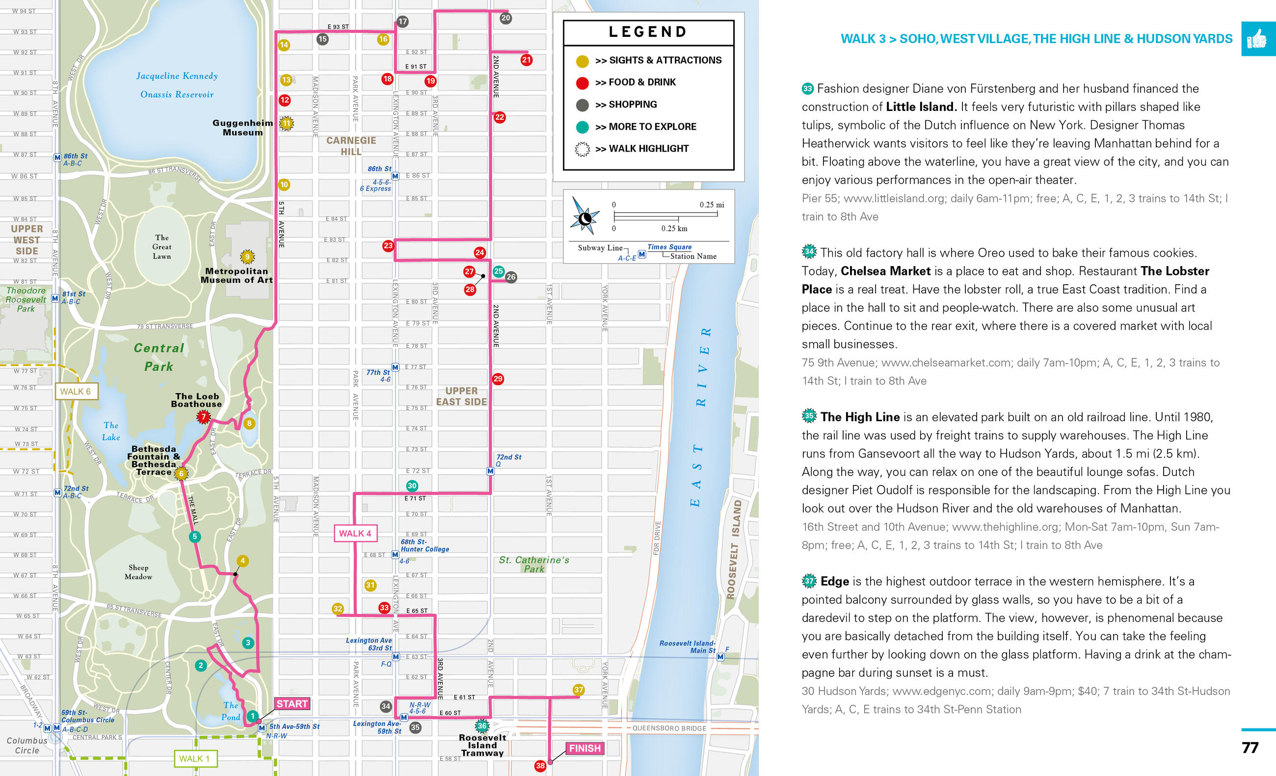 - Walk through the city’s coolest neighborhoods, including Soho, the West Village, the Lower East Side, Williamsburg, and more, with color-coded stops and turn-by-turn directions