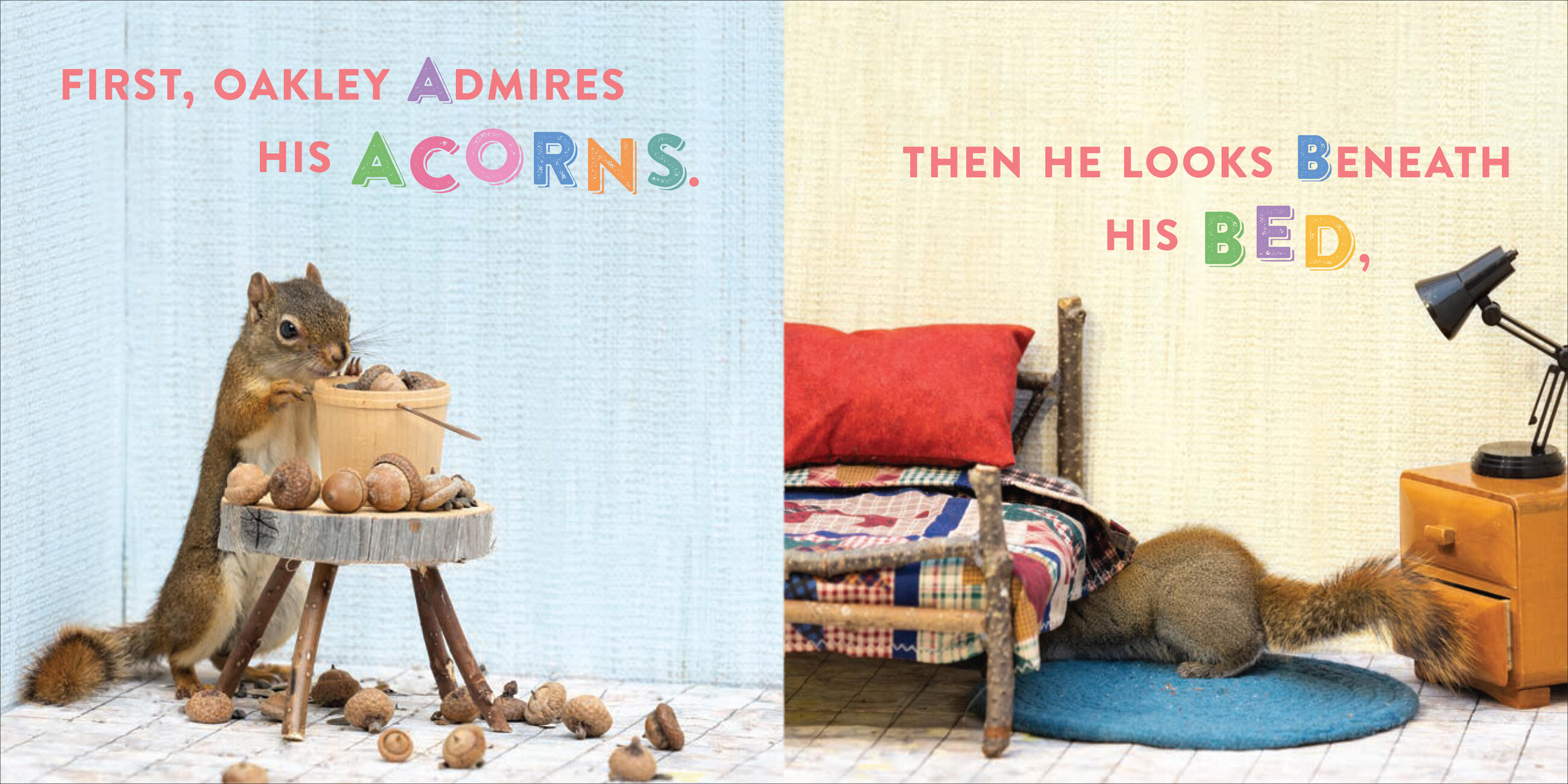 Oakley the Squirrel: The Search for Z is an alphabet book like no other. In it, we meet Little Oakley as he embarks on a quest to find the letter Z. He searches through an alphabet of human objects—looks beneath the Bed, claws through the Closet, digs through Drawers, examines his Easel, and so on. By the time he gets to a basket of yarn, Oakley starts to yawn, and soon falls asleep. And Z—as in, Zzzzzz!—appears!