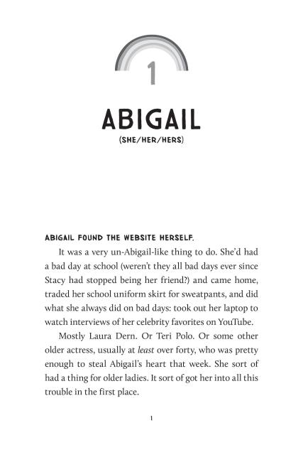 Twelve-year-old Abigail (she/her/hers) is so excited to spend her summer at Camp QUILTBAG, an inclusive retreat for queer and trans kids. She can’t wait to find a community where she can be herself—and, she hopes, admit her crush on that one hot older actress to kids who will understand.