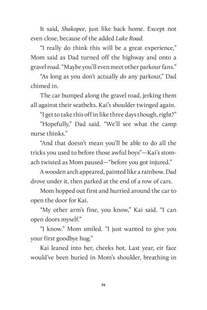 Thirteen-year-old Kai (e/em/eir) is not as excited. E just wants to hang out with eir best friend and eir parkour team. And e definitely does not want to think about the incident that left eir arm in a sling—the incident that also made Kai’s parents determined to send em somewhere e can feel like emself.