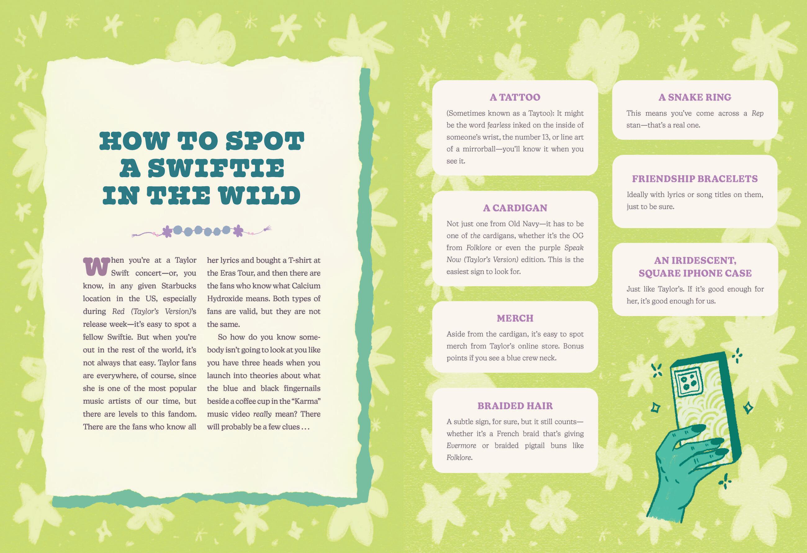 - Have fun looking back on concert traditions and inside jokes, roll your eyes at the most embarrassing clowning moments, take in era-specific Swiftie style lessons, read exclusive stories of fan encounters and author Nicole Pomarico’s own experiences meeting Taylor Swift and her parents.