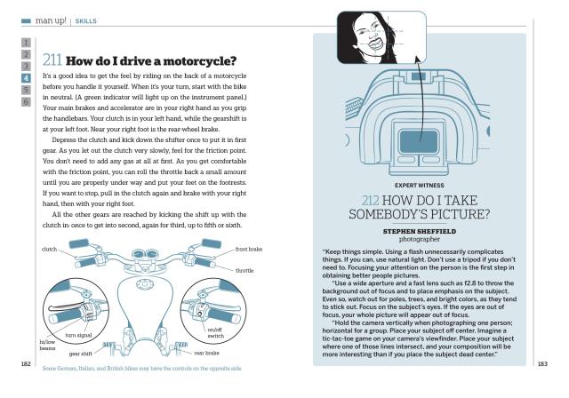 “Quick fixes to the many vexing problems an ordinary dude may wind up facing in his lifetime. From how to change a flat tire to how to survive a night in jail, this guide has the solutions.”
