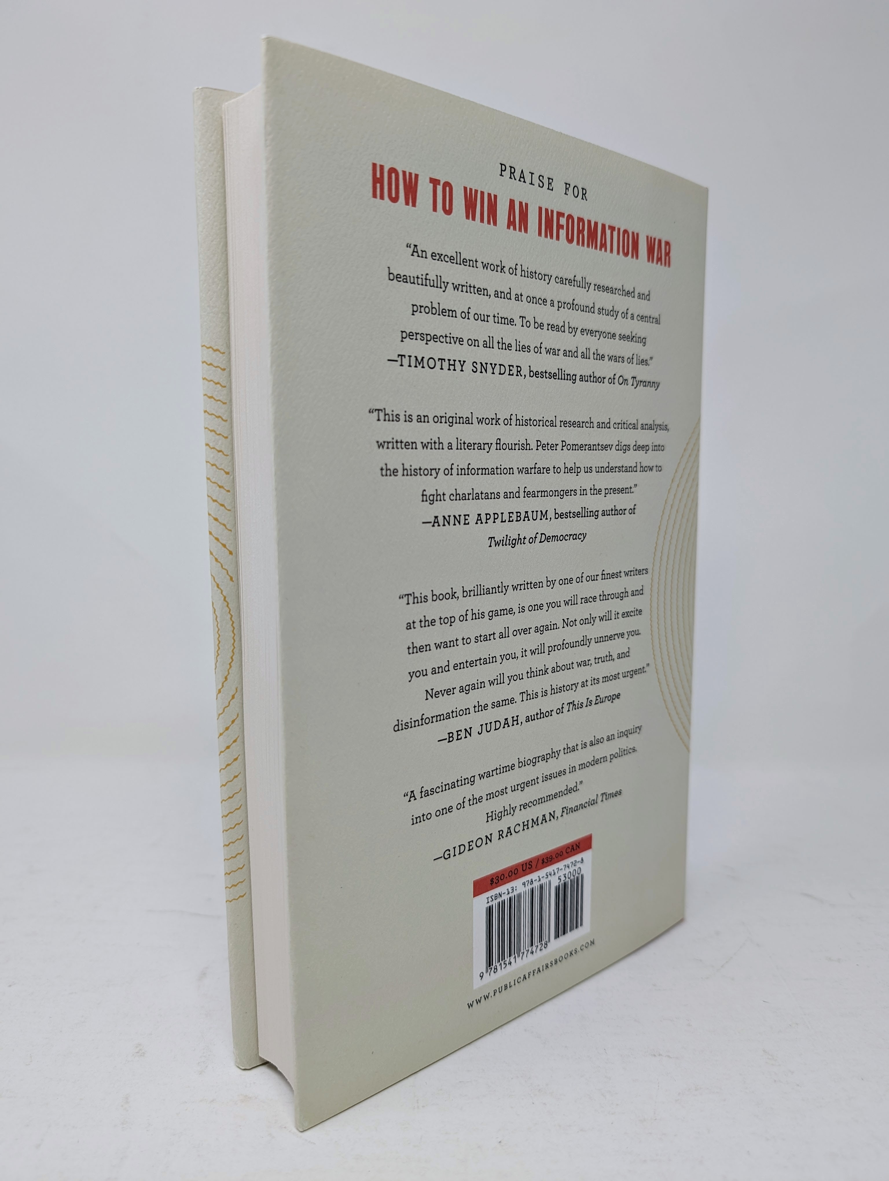 “A must-read… “How to Win an Information War” succeeds wildly (if, in places, despite itself) at raising deeper philosophical questions about propaganda, its role in shaping national identities, and its use by the good and the evil alike, in politics and in war. With this addictive page-turner, Pomerantsev’s incisiveness once again sets his work above and apart from the often-crowded disinfo-hype genre.”Gavin Wilde, Lawfare