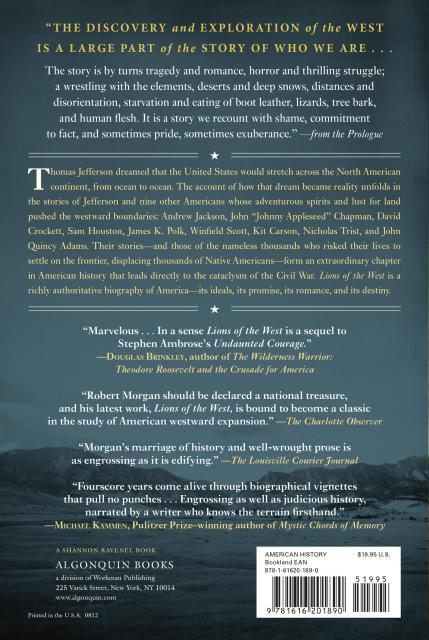 “Lions of the West is a compelling and insightful history that reads like the talk of a learned companion...Morgan entertains with adventures and details, both high-minded and handy. His largest achievement is something of special note here. In his fiction, poetry, and history, Morgan represents a Scots-Irish/British tradition, and fuses, for all of America, romantic and pragmatic traditions.” –Asheville Citizen-Times