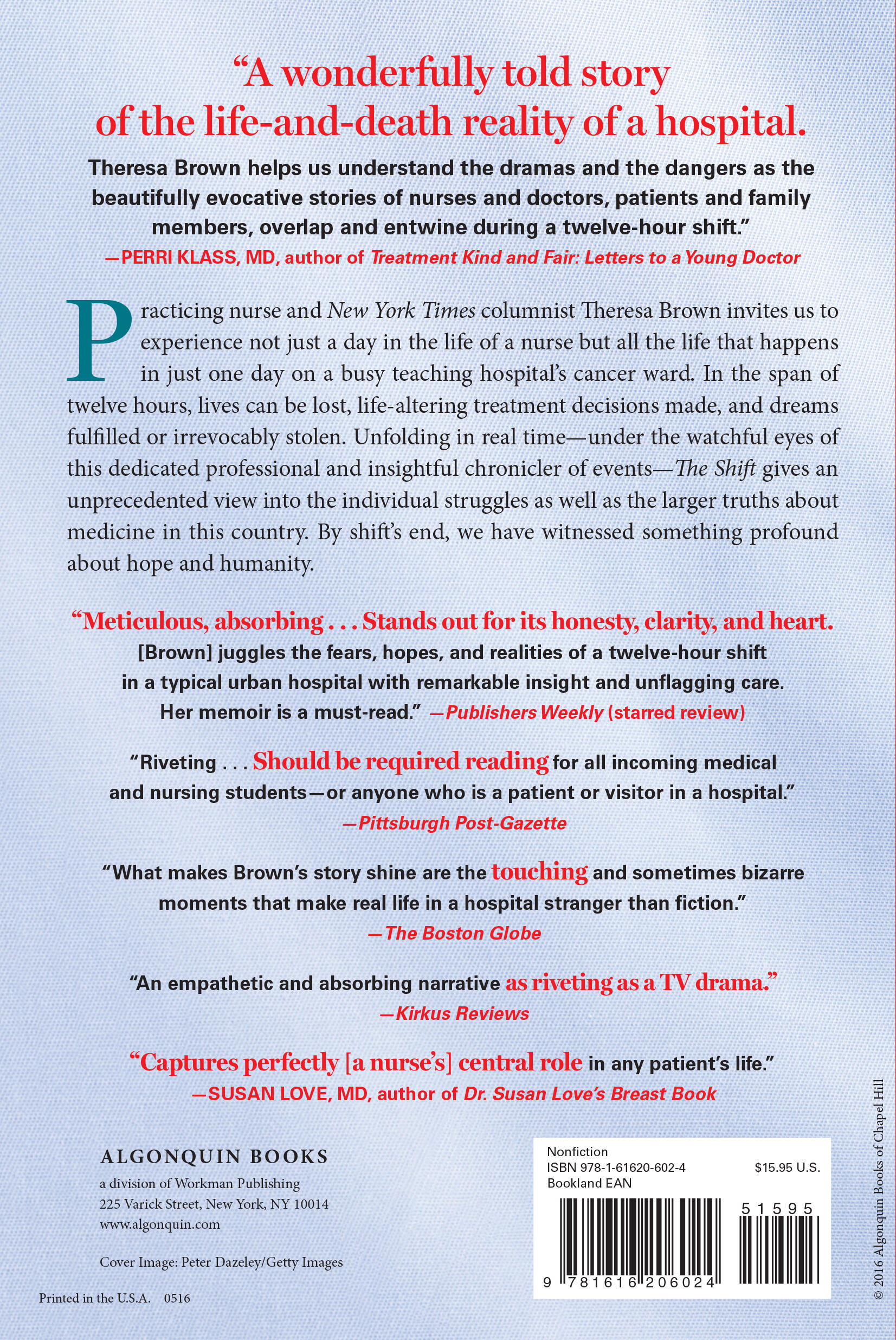 Practicing nurse and New York Times columnist Theresa Brown invites us to experience not just a day in the life of a nurse but all the life that happens in just one day on a busy teaching hospital’s cancer ward. In the span of twelve hours, lives can be lost, life-altering treatment decisions made, and dreams fulfilled or irrevocably stolen. Unfolding in real time—under the watchful eyes of this dedicated professional and insightful chronicler of events—The Shift gives an unprecedented view into the individual struggles as well as the larger truths about medicine in this country. By shift’s end, we have witnessed something profound about hope and humanity.