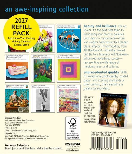 - This is a refill pack for the Gallery Calendar. It includes the pages of the Art Page-A-Day® Gallery Calendar 2027, but there is no plastic backer included.