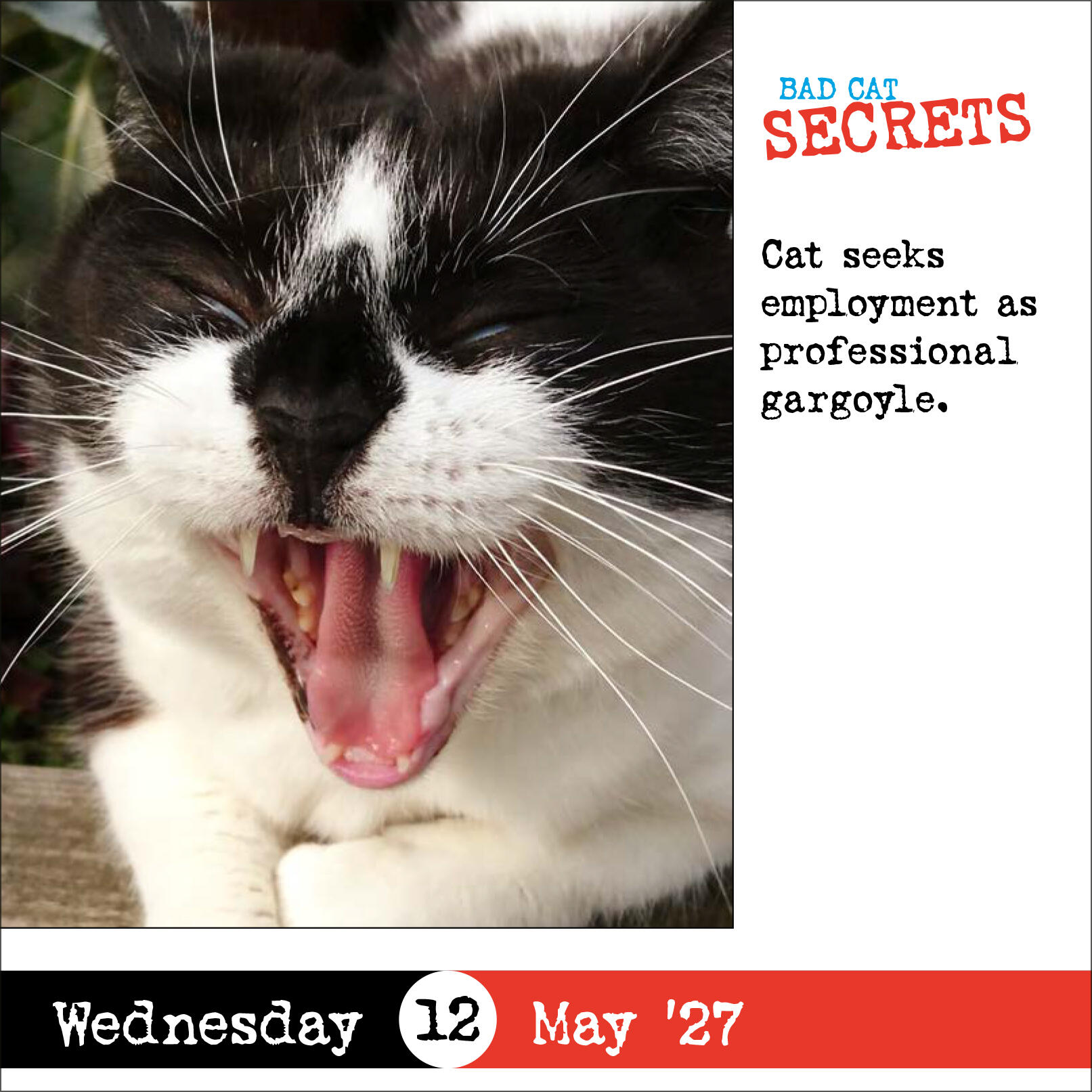 - OUTRAGEOUS CAT PHOTOS: Hundreds of cats are matched with funny, slightly naughty spot-on captions that showcase their bad sides. All photos are submitted by pet owners and calendar customers!
