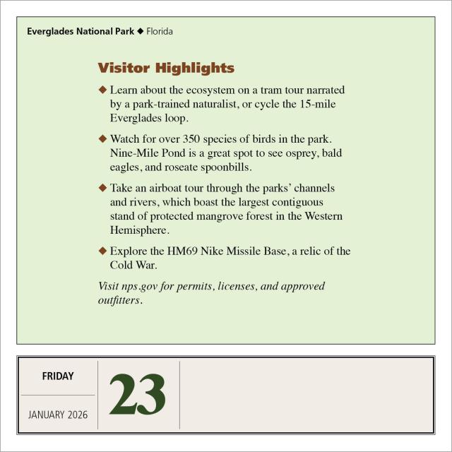 - PACKED WITH INFORMATION AND PHOTOS: Each weeks offers park facts, visitor highlights, and information about the flora and fauna of the park, plus stunning full-color photography.