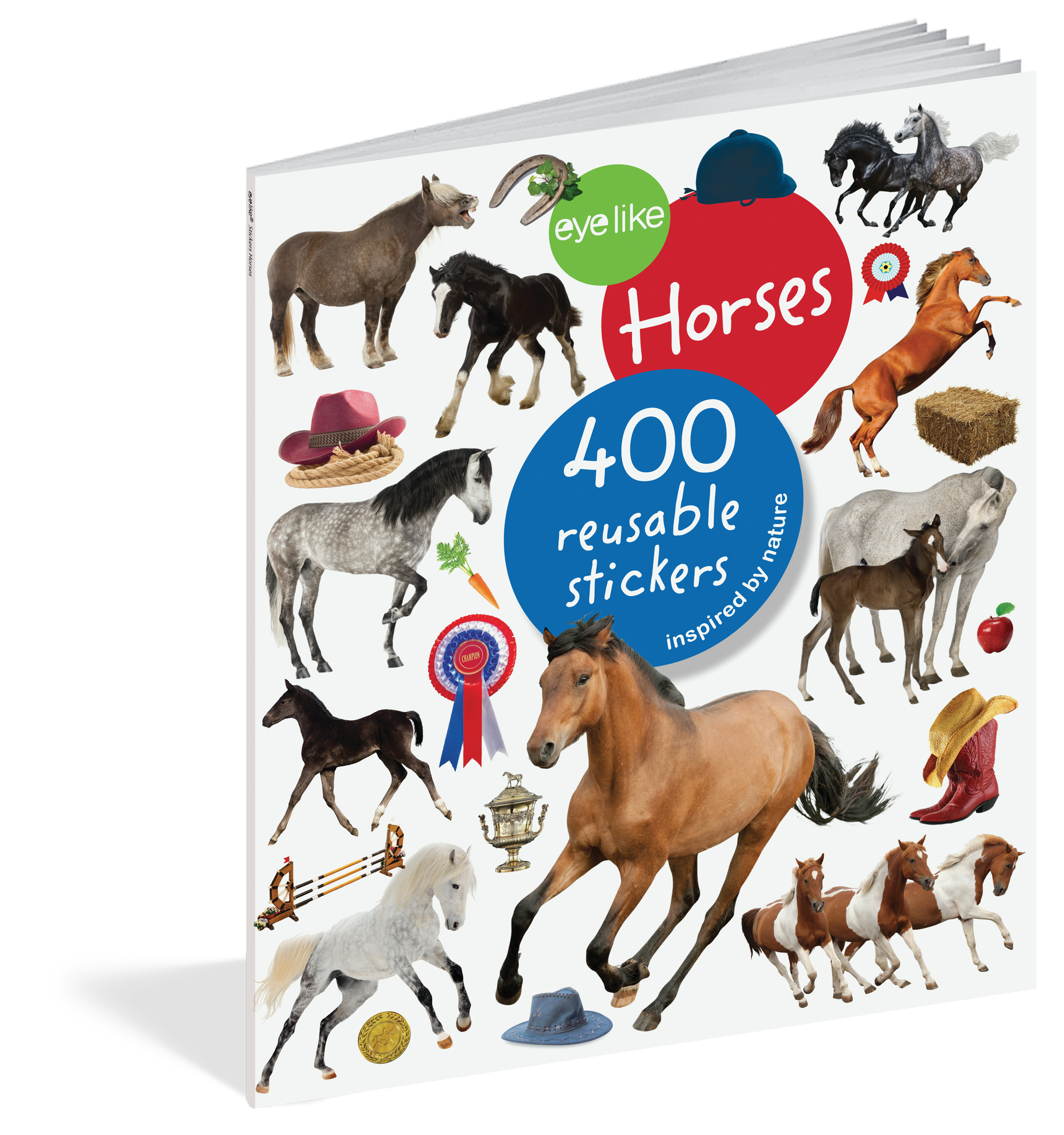 The full-color photographic stickers feature a variety of breeds in action–plus horse-themed paraphernalia like cowboy hats, horseshoes, and ribbons. Whether on windows, notebooks, lunch boxes, or scrapbooks, these peel-and-place stickers are perfect for creating your own work of art anytime, anywhere, and are designed to be stuck on, peeled off, and stuck on again without tearing or losing their “stick.” The books’ inside covers are glossy illustrated backgrounds on which kids can create lively and original sticker scenes―and then change them whenever they like.