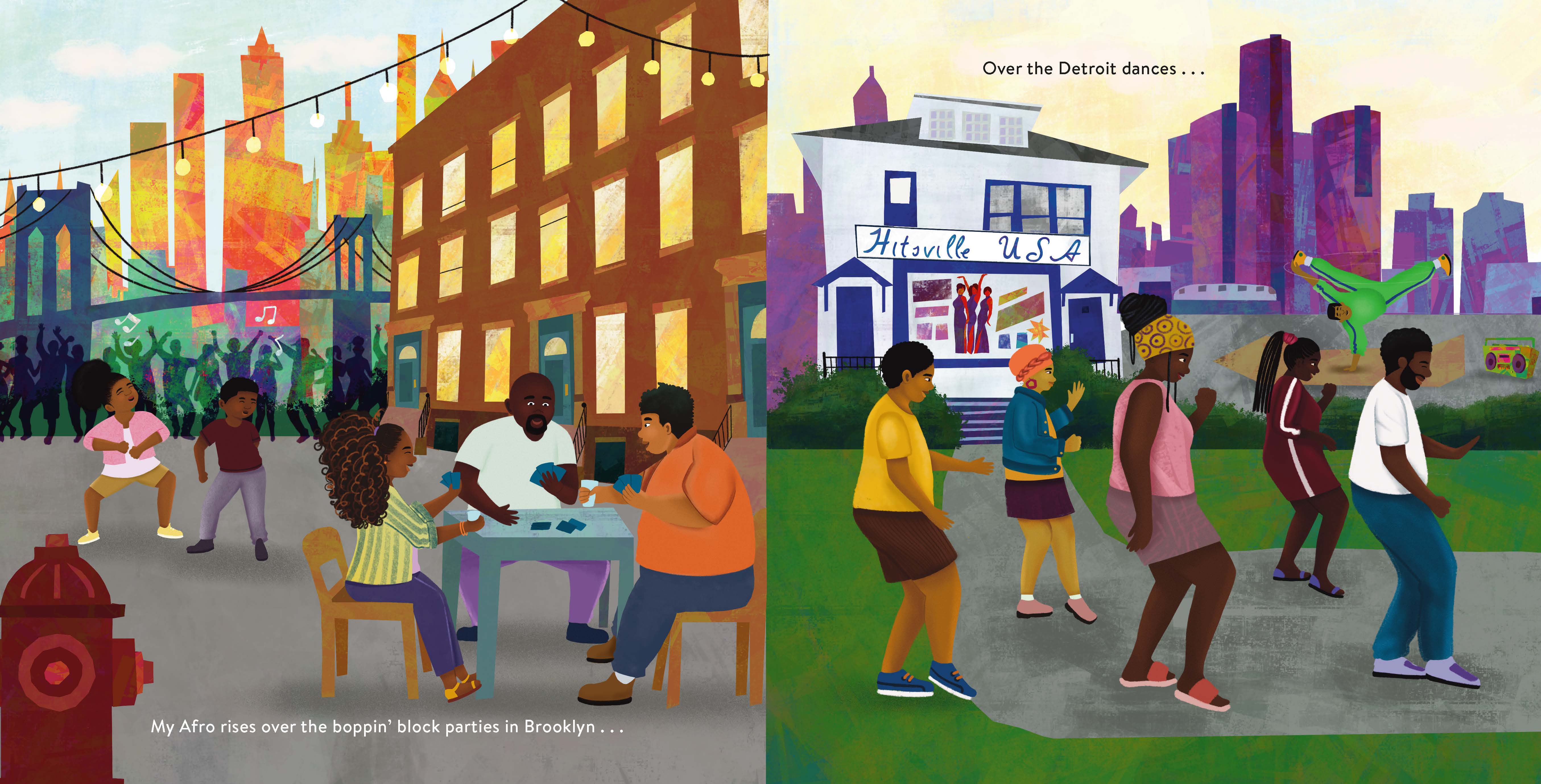 “A powerful and vibrant celebration of self-identity and cultural pride. Each page is a metaphor, describing different Black American cultural touchstones, such as pride in African culture, food, and family gatherings, significant cities around the U.S., as well as meaningful games, dances, and music. The language is brief and poetic, making it accessible to the youngest readers…and the vibrant, joyful art is a perfect match to the positive, uplifting text. A first choice for elementary level libraries.”School Library Journal, starred review